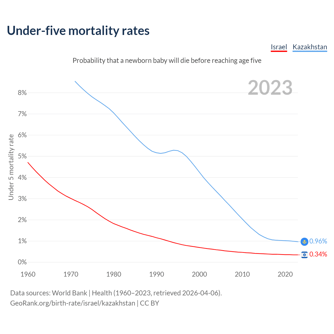 The chance that a newborn baby will die before reaching age five is 0.34% in Israel and 0.96% in Kazakhstan. Above is a chart with historical data on under-five mortality rates.