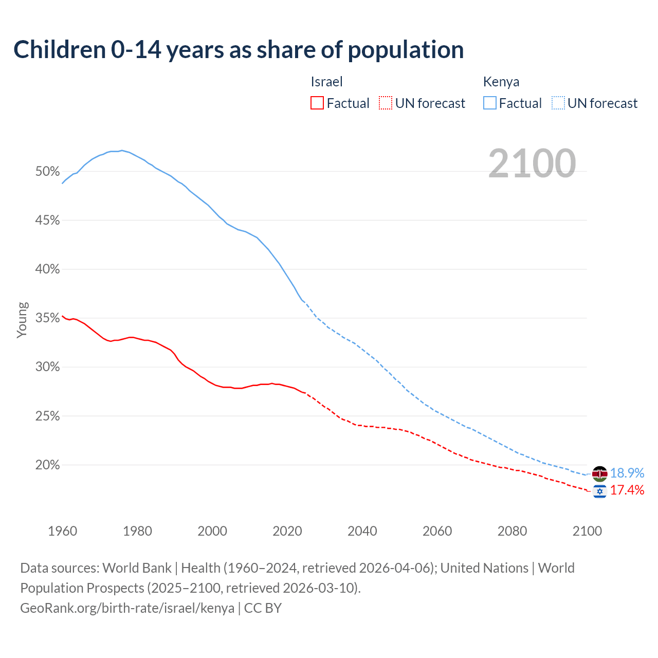 According to the latest available data on birth rates, the fertility rate in Israel was 2.85 children per woman in 2023, compared to 3.21 in Kenya in 2023. The replacement level is considered to be 2.1 children per woman.