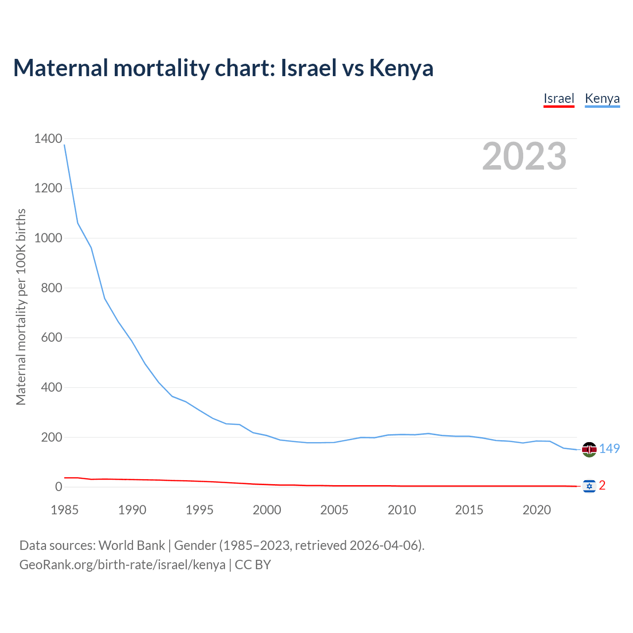 The maternal mortality rate, which is the probability of dying during childbirth or within 42 days of pregnancy termination, is 2 deaths per 100,000 live births in Israel, compared to 149 deaths in Kenya.