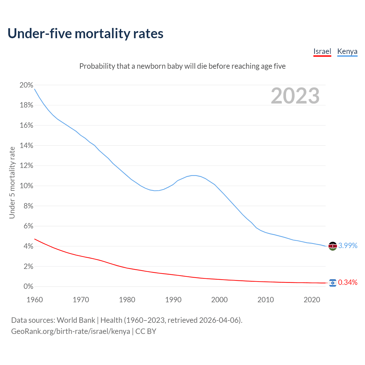 The chance that a newborn baby will die before reaching age five is 0.34% in Israel and 3.99% in Kenya. Above is a chart with historical data on under-five mortality rates.