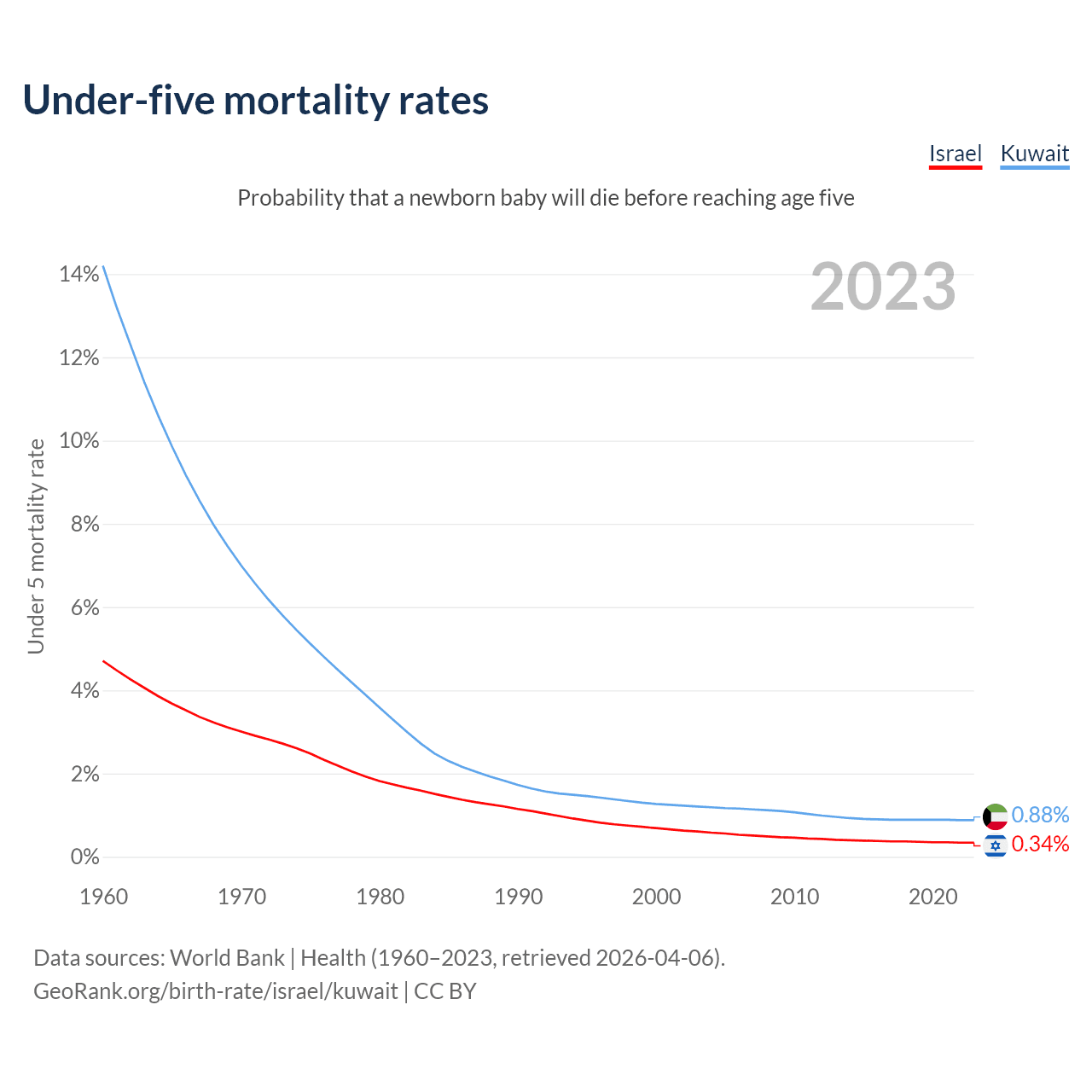 The chance that a newborn baby will die before reaching age five is 0.34% in Israel and 0.88% in Kuwait. Above is a chart with historical data on under-five mortality rates.
