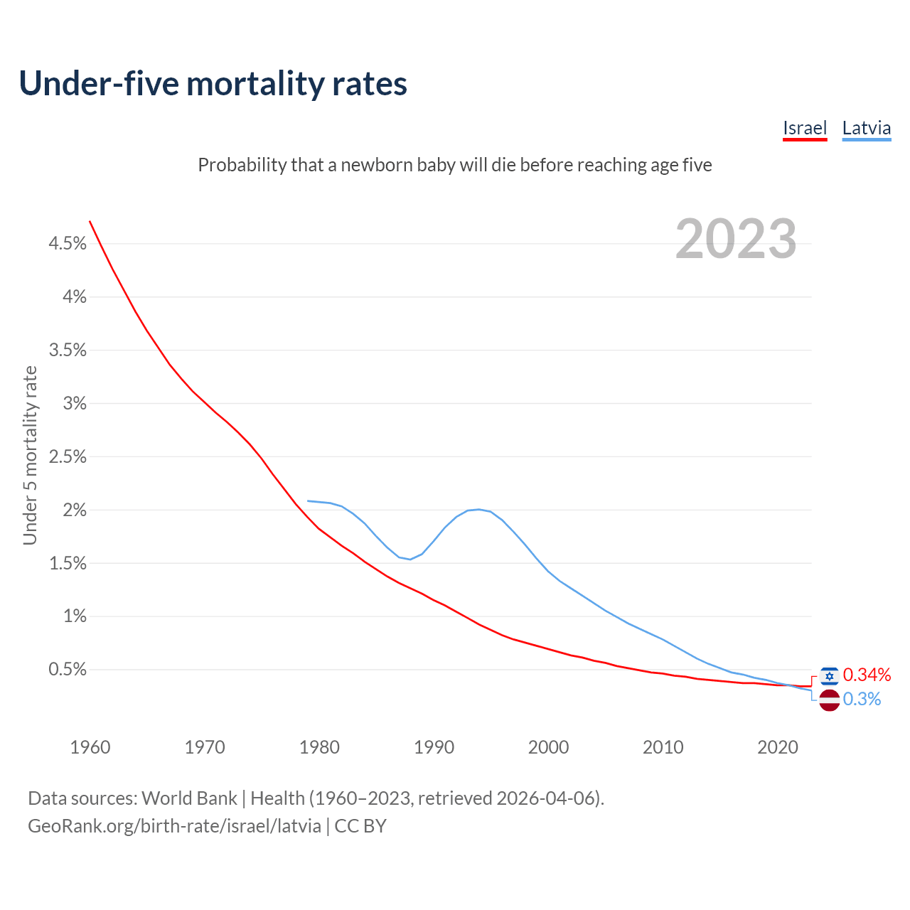 The chance that a newborn baby will die before reaching age five is 0.34% in Israel and 0.3% in Latvia. Above is a chart with historical data on under-five mortality rates.