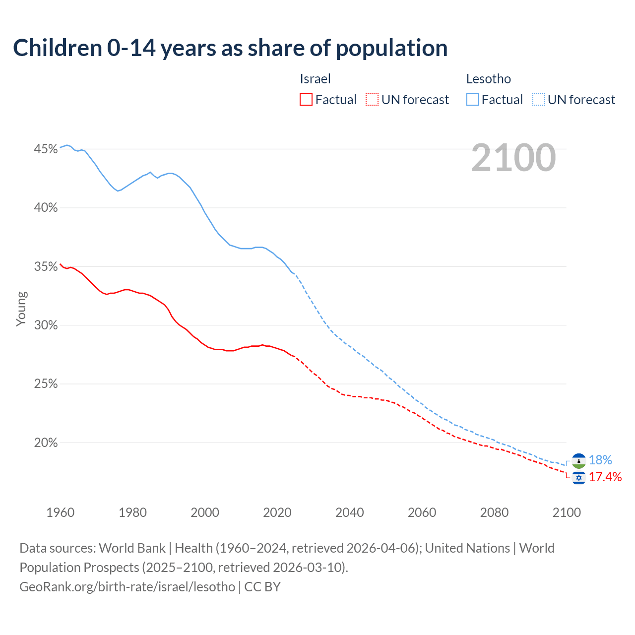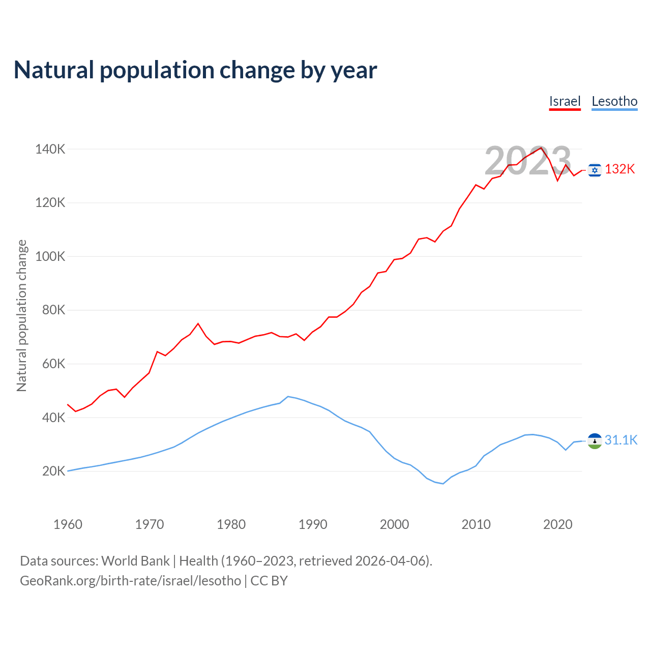 According to the latest available data on birth rates, the fertility rate in Israel was 2.85 children per woman in 2023, compared to 2.69 in Lesotho in 2023. The replacement level is considered to be 2.1 children per woman.