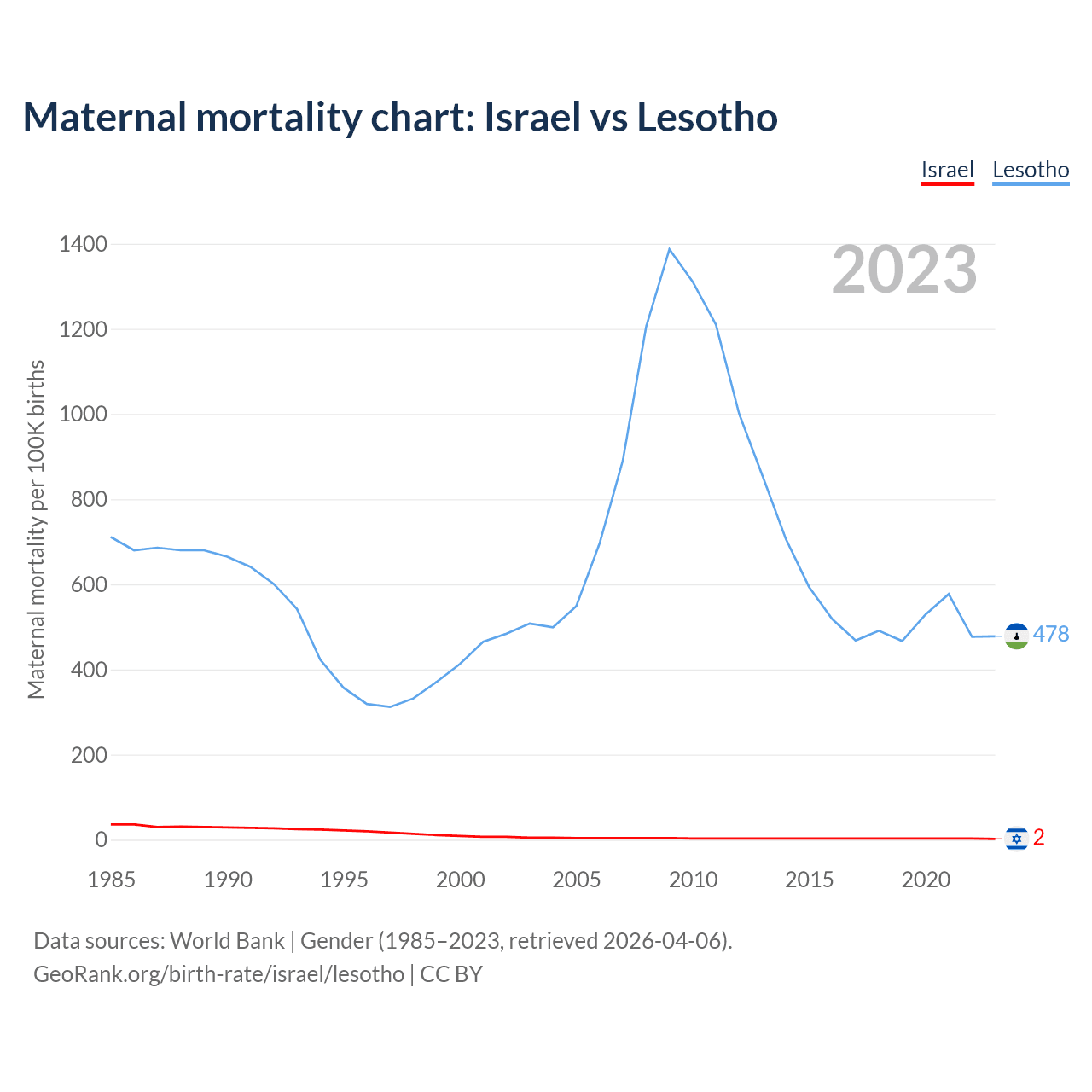 The maternal mortality rate, which is the probability of dying during childbirth or within 42 days of pregnancy termination, is 2 deaths per 100,000 live births in Israel, compared to 478 deaths in Lesotho.