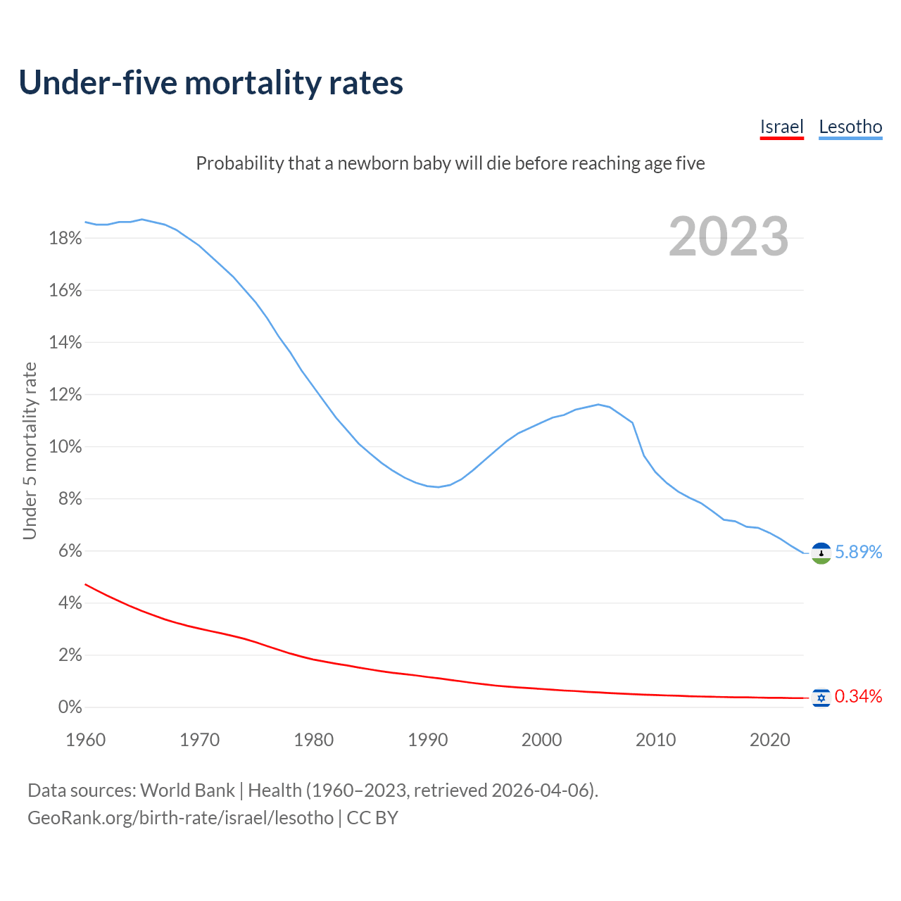The chance that a newborn baby will die before reaching age five is 0.34% in Israel and 5.89% in Lesotho. Above is a chart with historical data on under-five mortality rates.