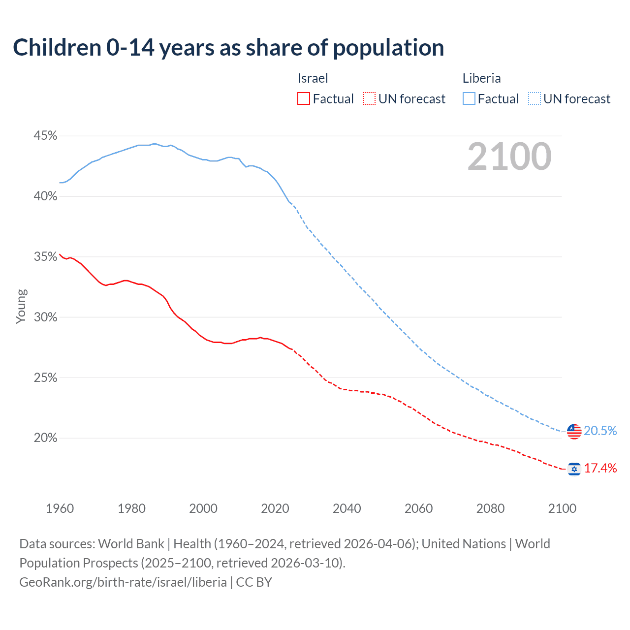According to the latest available data on birth rates, the fertility rate in Israel was 2.85 children per woman in 2023, compared to 3.95 in Liberia in 2023. The replacement level is considered to be 2.1 children per woman.