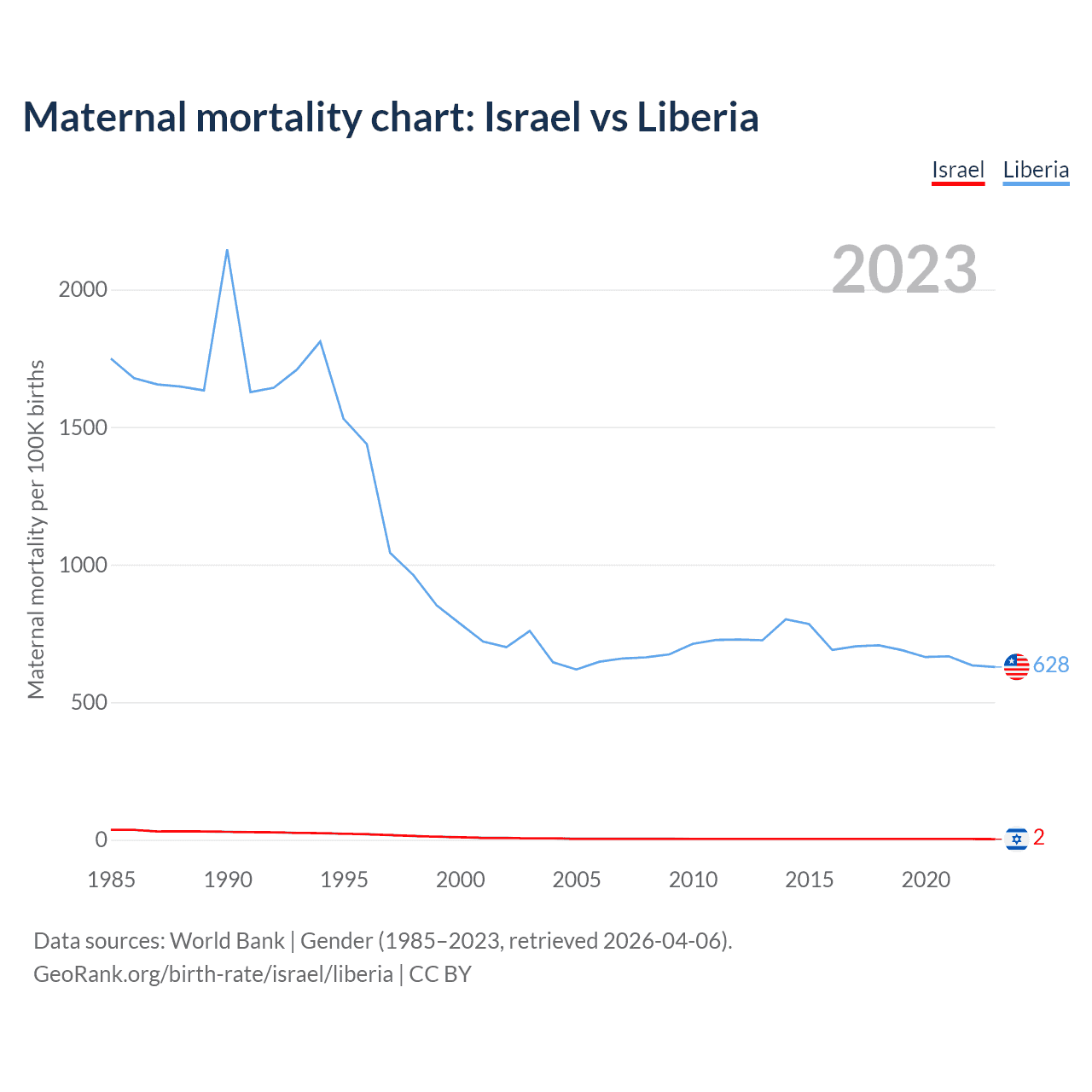The maternal mortality rate, which is the probability of dying during childbirth or within 42 days of pregnancy termination, is 2 deaths per 100,000 live births in Israel, compared to 628 deaths in Liberia.