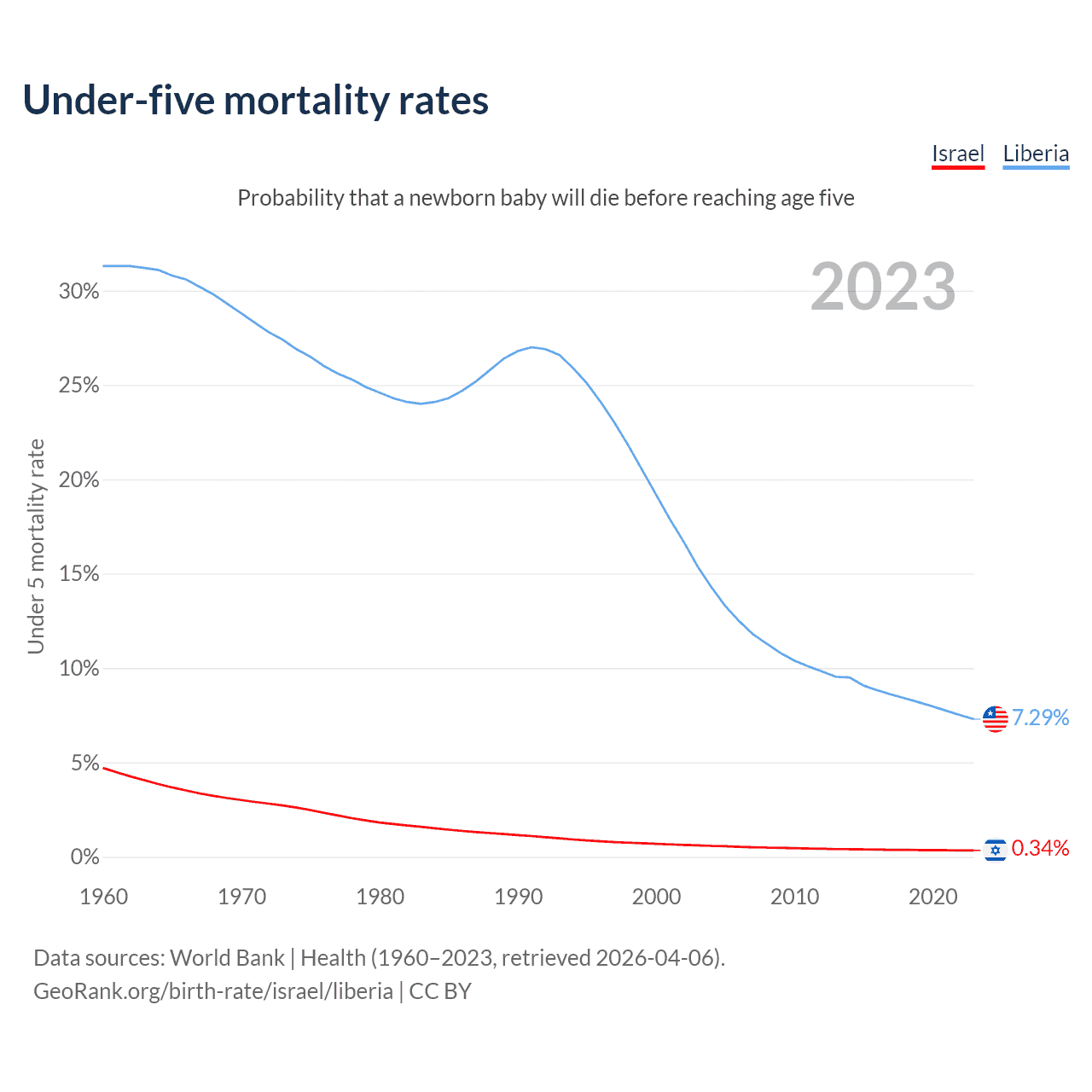 The chance that a newborn baby will die before reaching age five is 0.34% in Israel and 7.29% in Liberia. Above is a chart with historical data on under-five mortality rates.