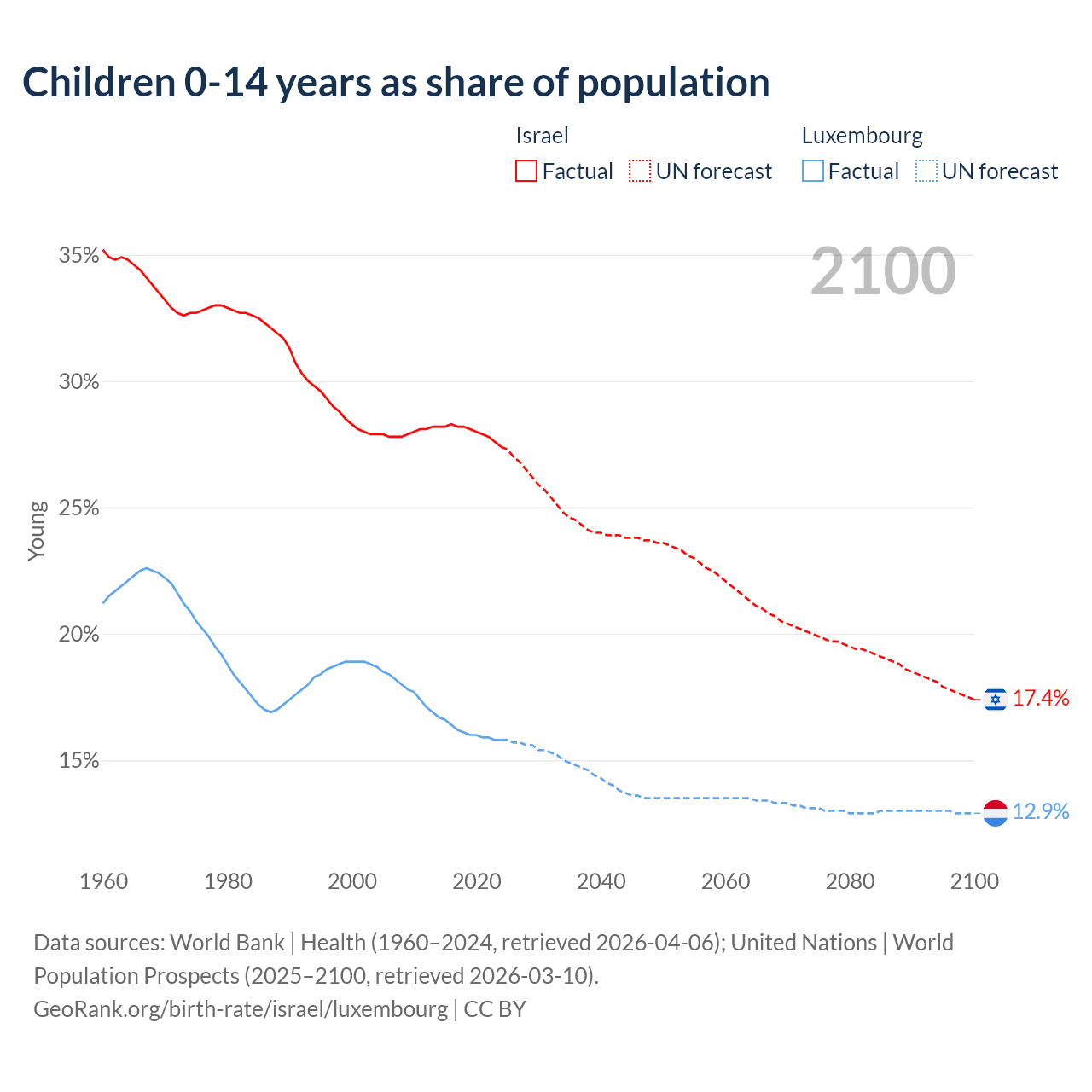 According to the latest available data on birth rates, the fertility rate in Israel was 2.85 children per woman in 2023, compared to 1.25 in Luxembourg in 2023. The replacement level is considered to be 2.1 children per woman.