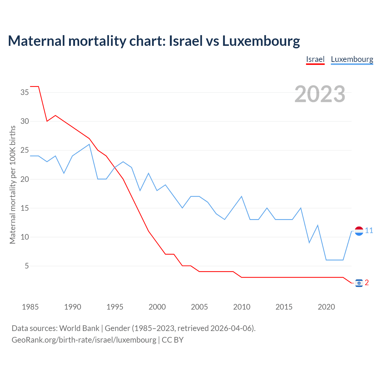 The maternal mortality rate, which is the probability of dying during childbirth or within 42 days of pregnancy termination, is 2 deaths per 100,000 live births in Israel, compared to 11 deaths in Luxembourg.