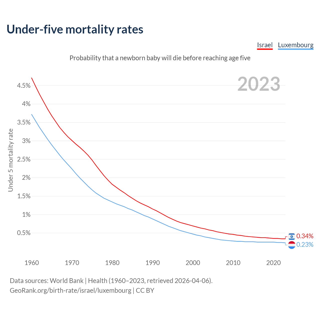 The chance that a newborn baby will die before reaching age five is 0.34% in Israel and 0.23% in Luxembourg. Above is a chart with historical data on under-five mortality rates.