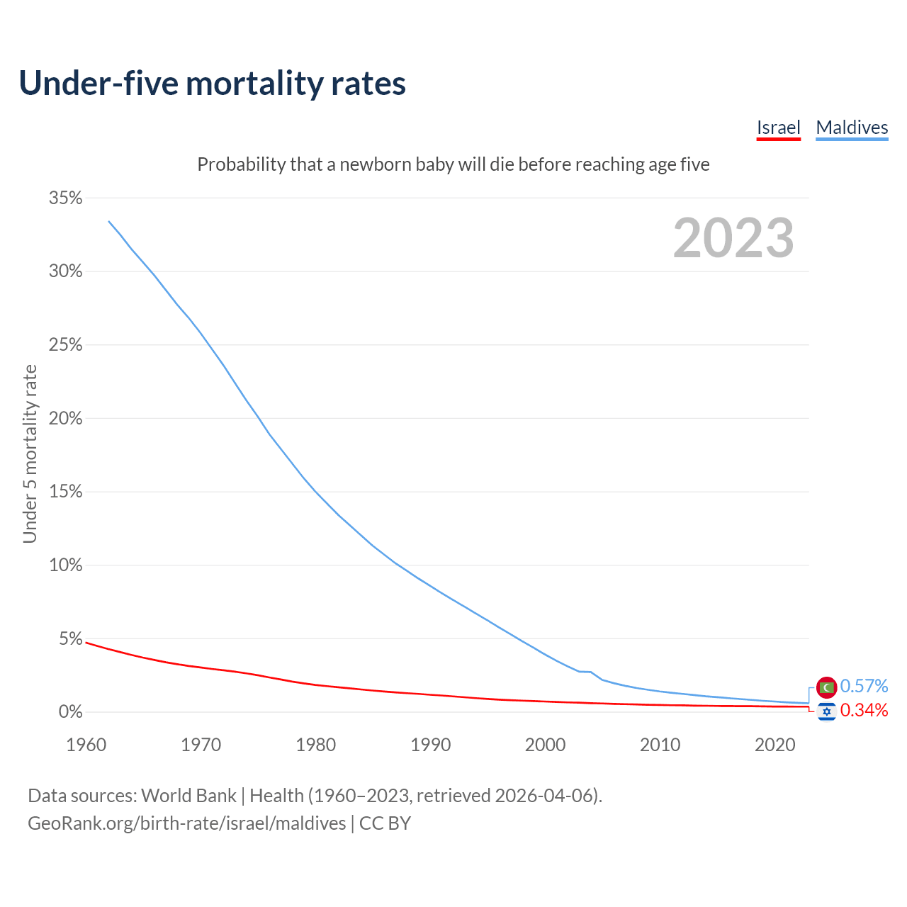 The chance that a newborn baby will die before reaching age five is 0.34% in Israel and 0.57% in Maldives. Above is a chart with historical data on under-five mortality rates.