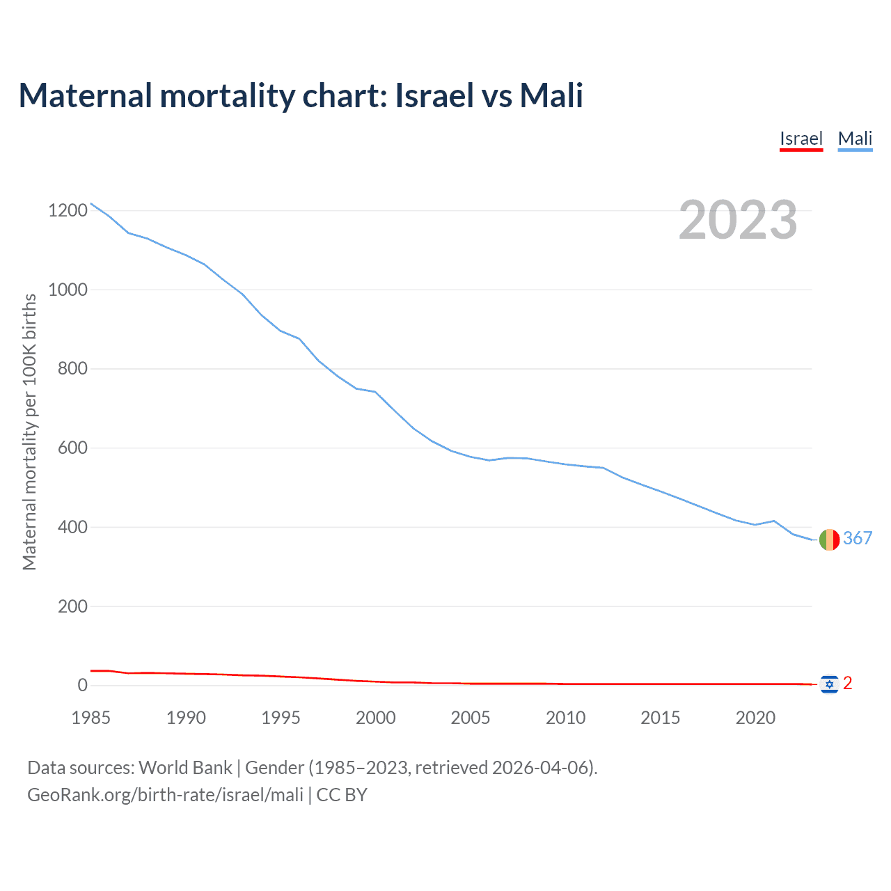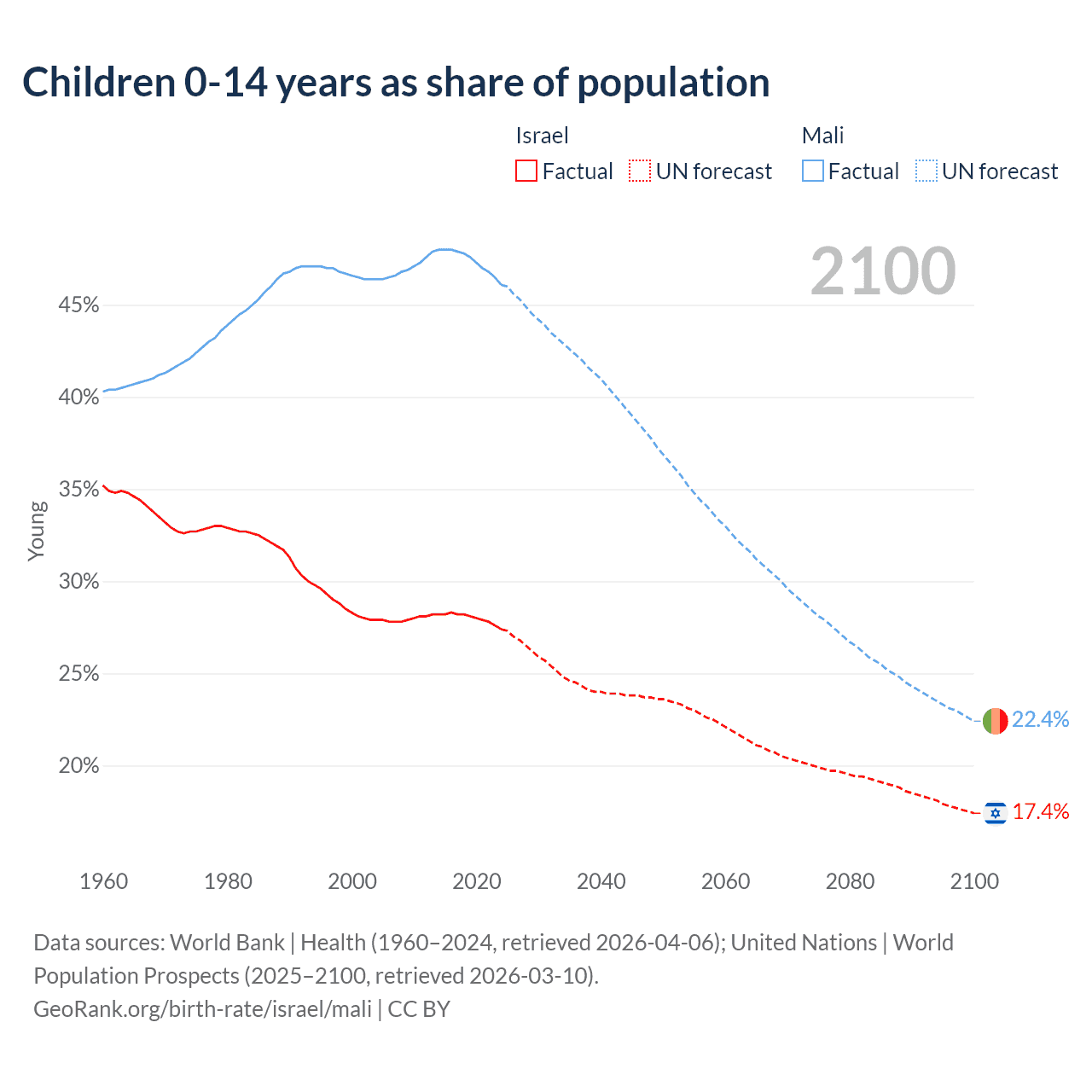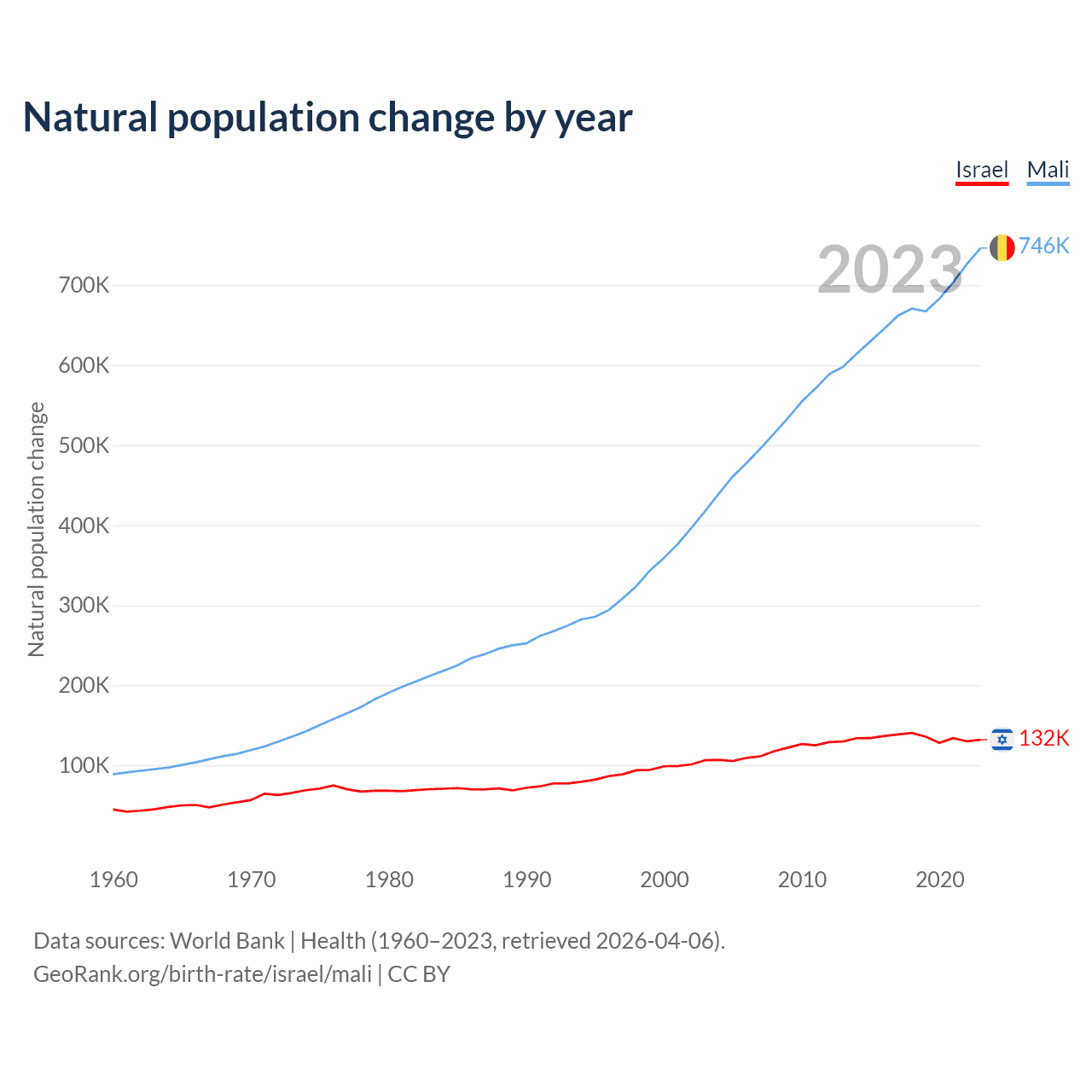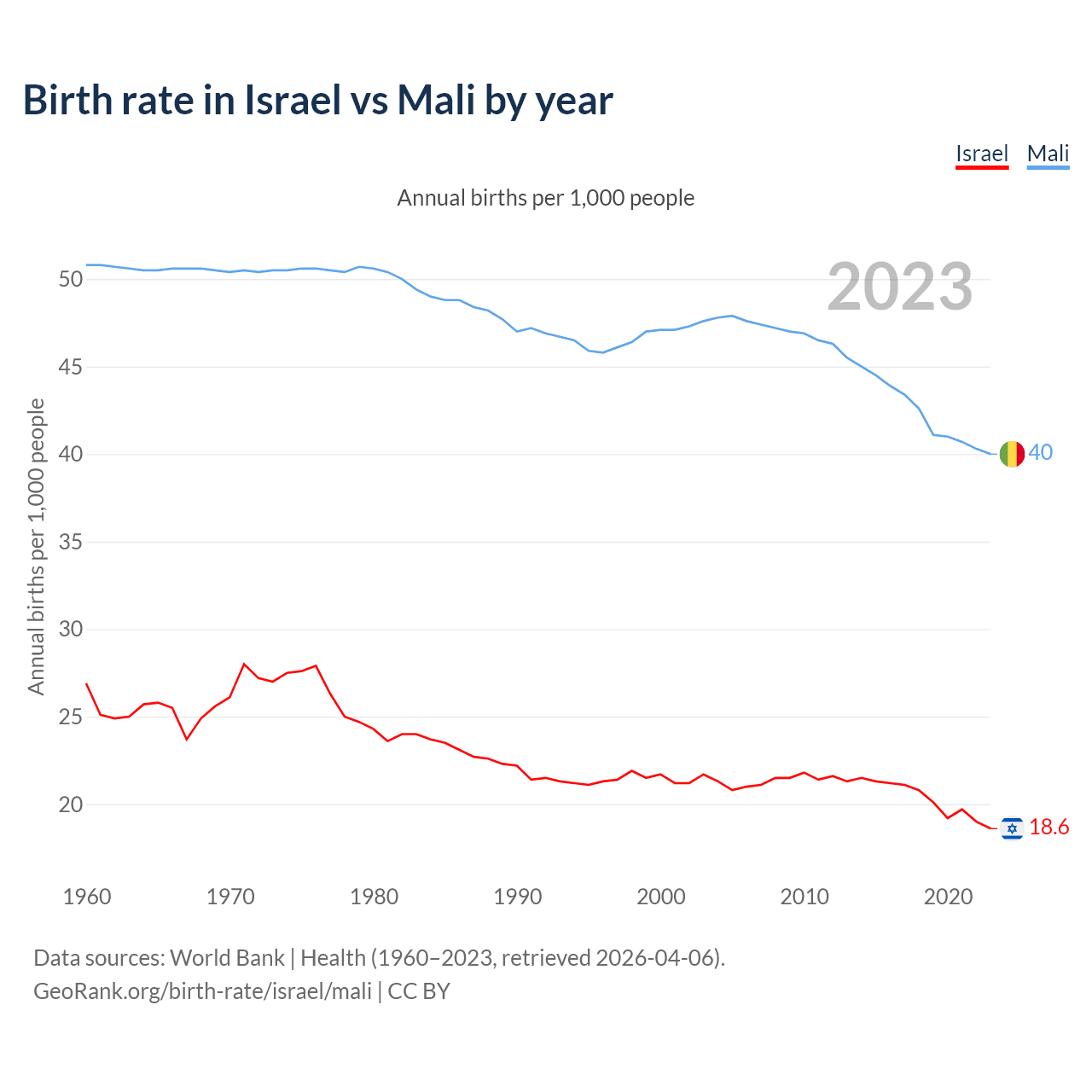 Israel has an annual birth rate of 18.6 births per 1,000 people, compared to 40 for Mali. The average number of children a woman is expected to have during her lifetime — the fertility rate, is 2.85 in Israel and 5.61 in Mali — 97% difference.