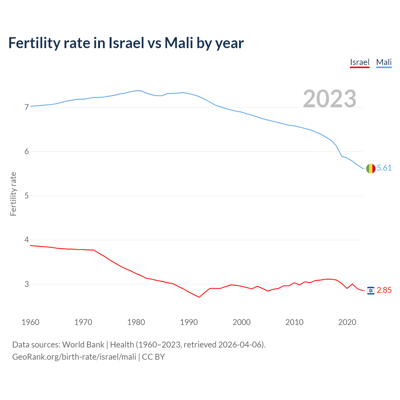 According to the latest available data on birth rates, the fertility rate in Israel was 2.85 children per woman in 2023, compared to 5.61 in Mali in 2023. The replacement level is considered to be 2.1 children per woman.