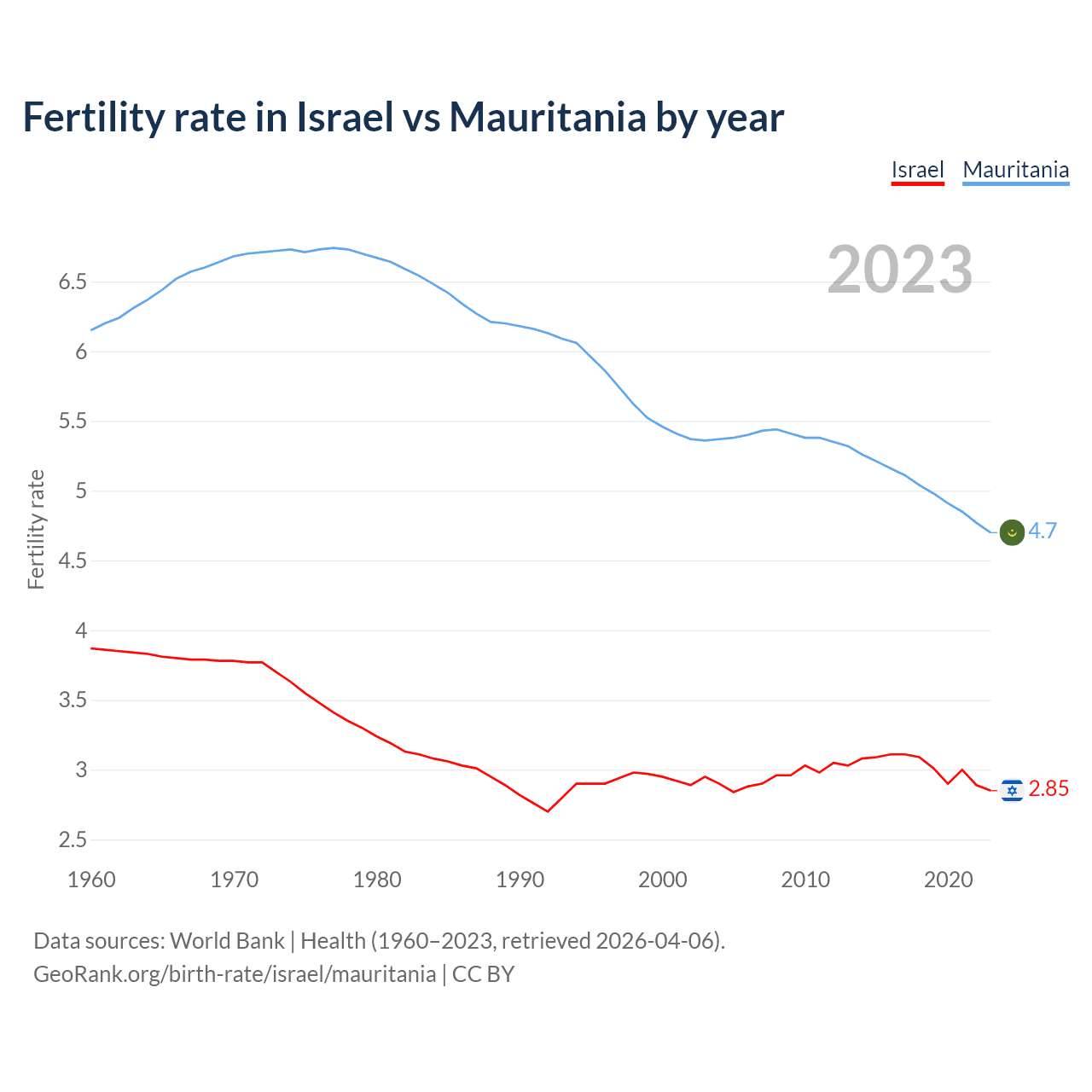 According to the latest available data on birth rates, the fertility rate in Israel was 2.85 children per woman in 2023, compared to 4.7 in Mauritania in 2023. The replacement level is considered to be 2.1 children per woman.