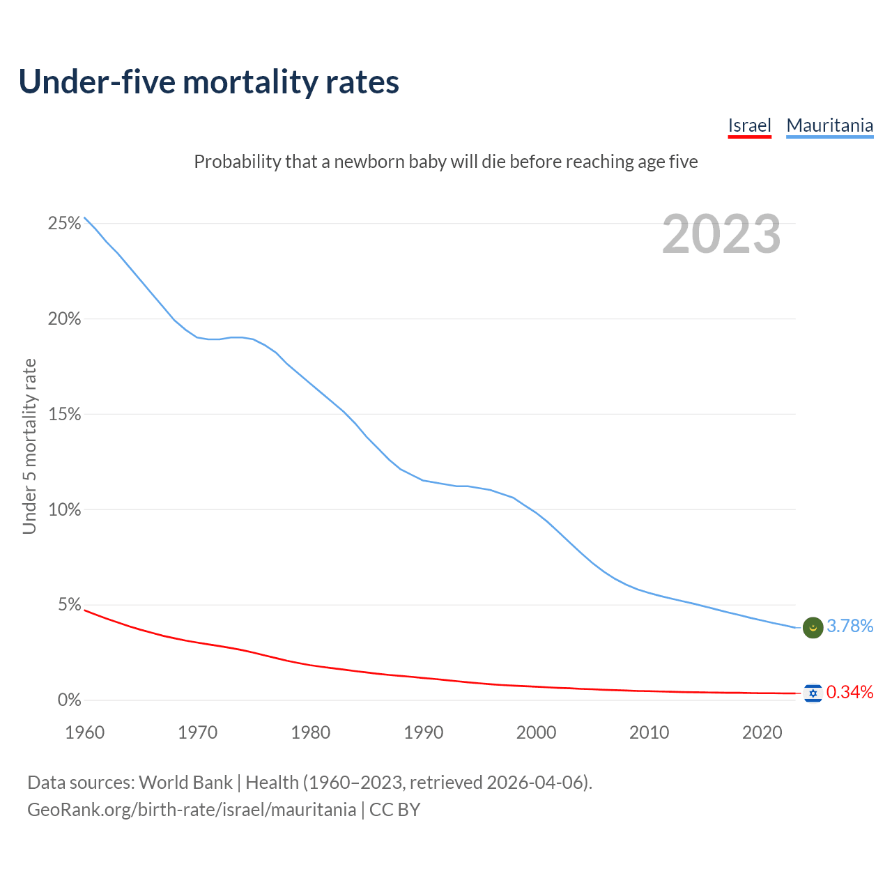The chance that a newborn baby will die before reaching age five is 0.34% in Israel and 3.78% in Mauritania. Above is a chart with historical data on under-five mortality rates.