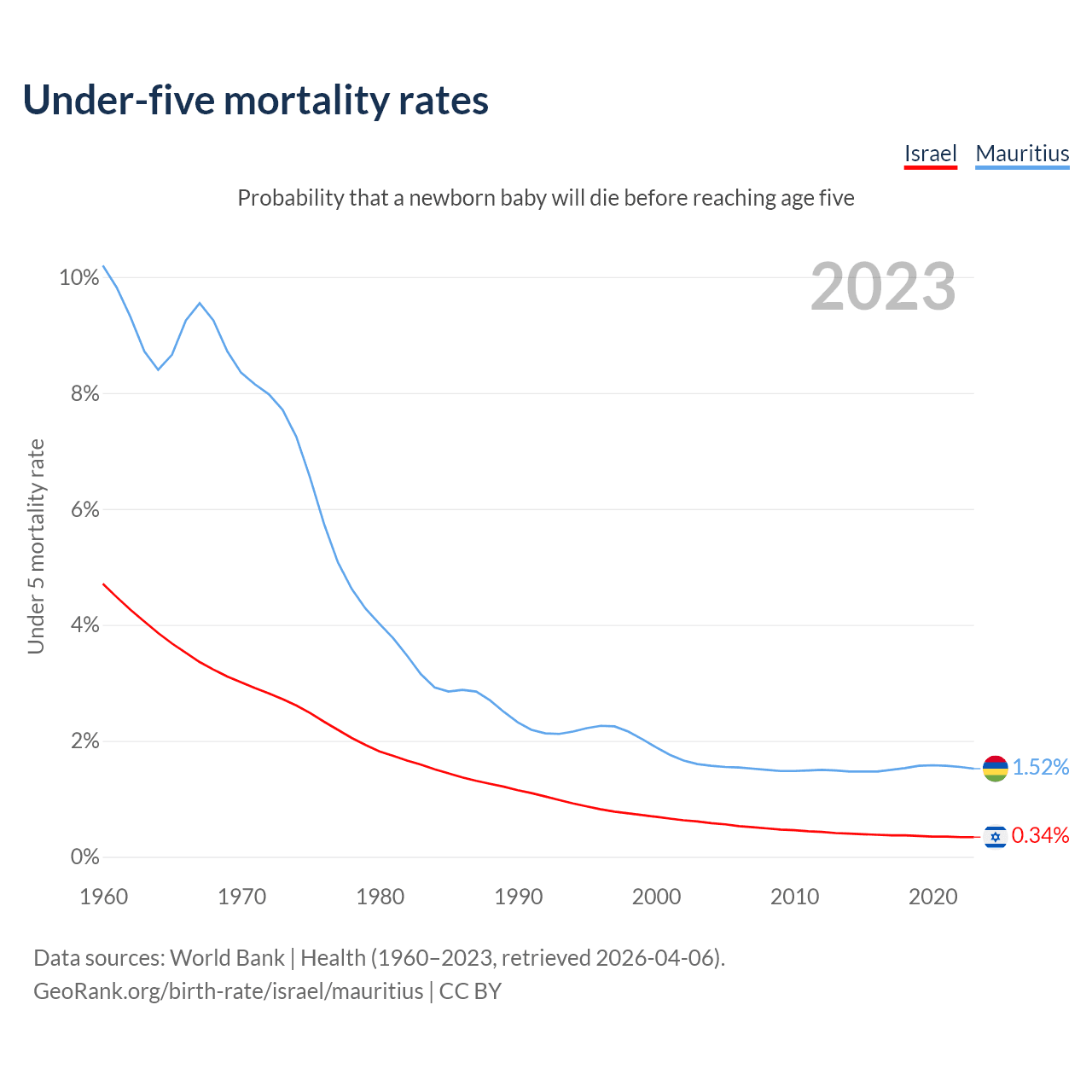 The chance that a newborn baby will die before reaching age five is 0.34% in Israel and 1.52% in Mauritius. Above is a chart with historical data on under-five mortality rates.