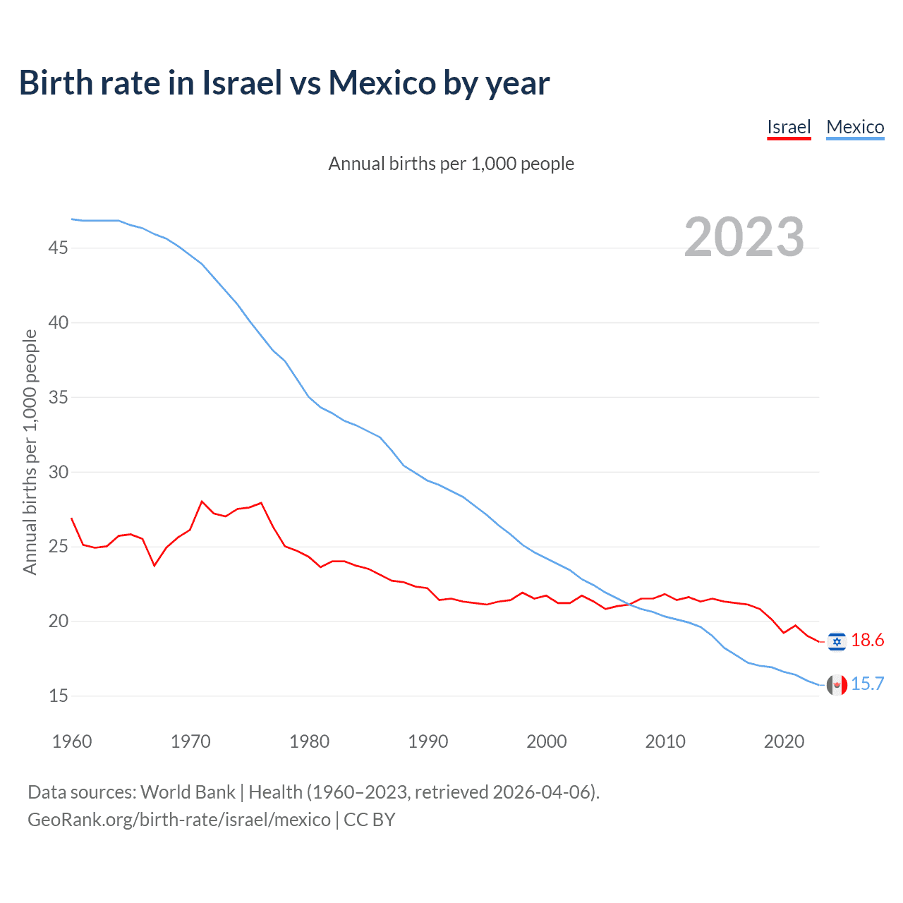Israel has an annual birth rate of 18.6 births per 1,000 people, compared to 15.7 for Mexico. The average number of children a woman is expected to have during her lifetime — the fertility rate, is 2.85 in Israel and 1.91 in Mexico — 33% difference.
