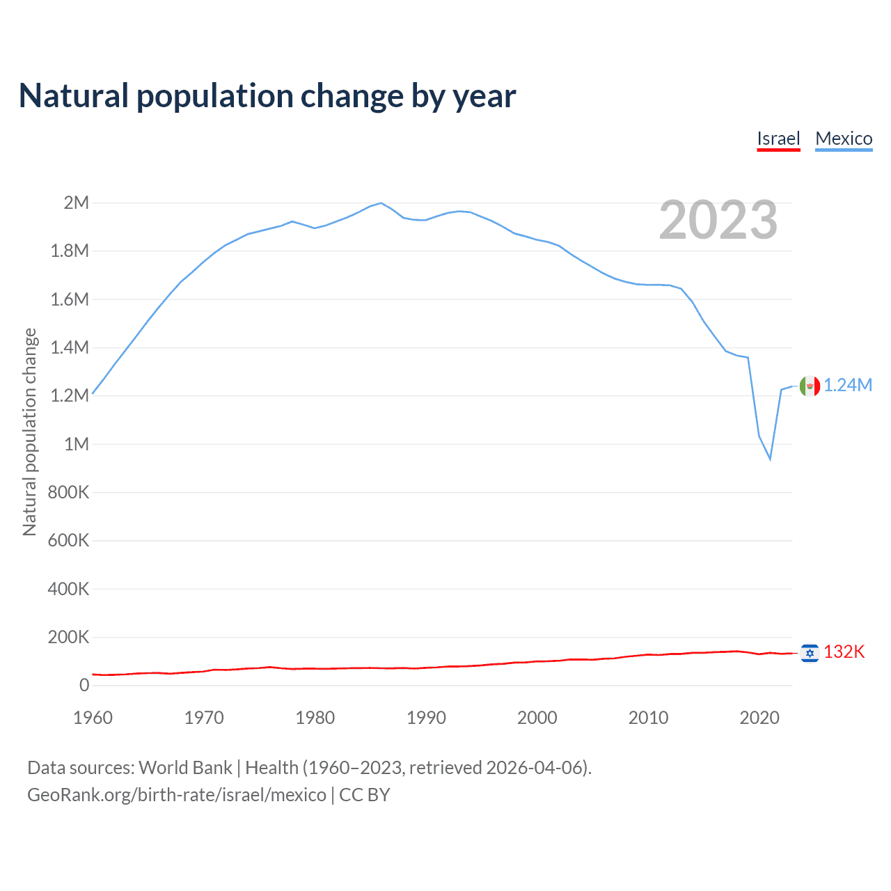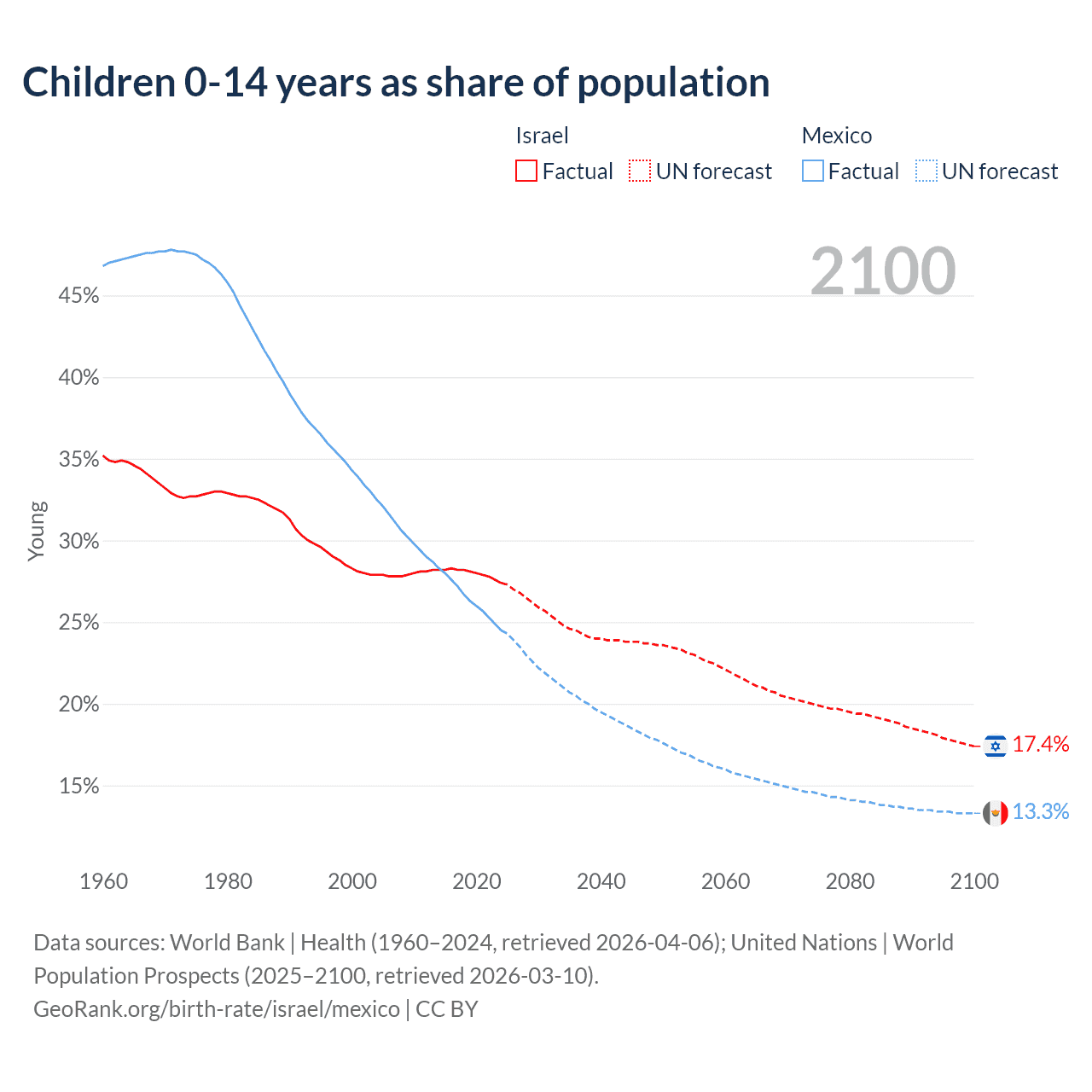 According to the latest available data on birth rates, the fertility rate in Israel was 2.85 children per woman in 2023, compared to 1.91 in Mexico in 2023. The replacement level is considered to be 2.1 children per woman.