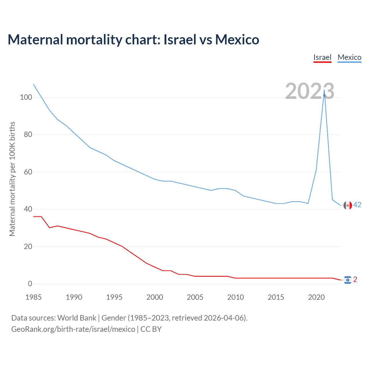 The maternal mortality rate, which is the probability of dying during childbirth or within 42 days of pregnancy termination, is 2 deaths per 100,000 live births in Israel, compared to 42 deaths in Mexico.