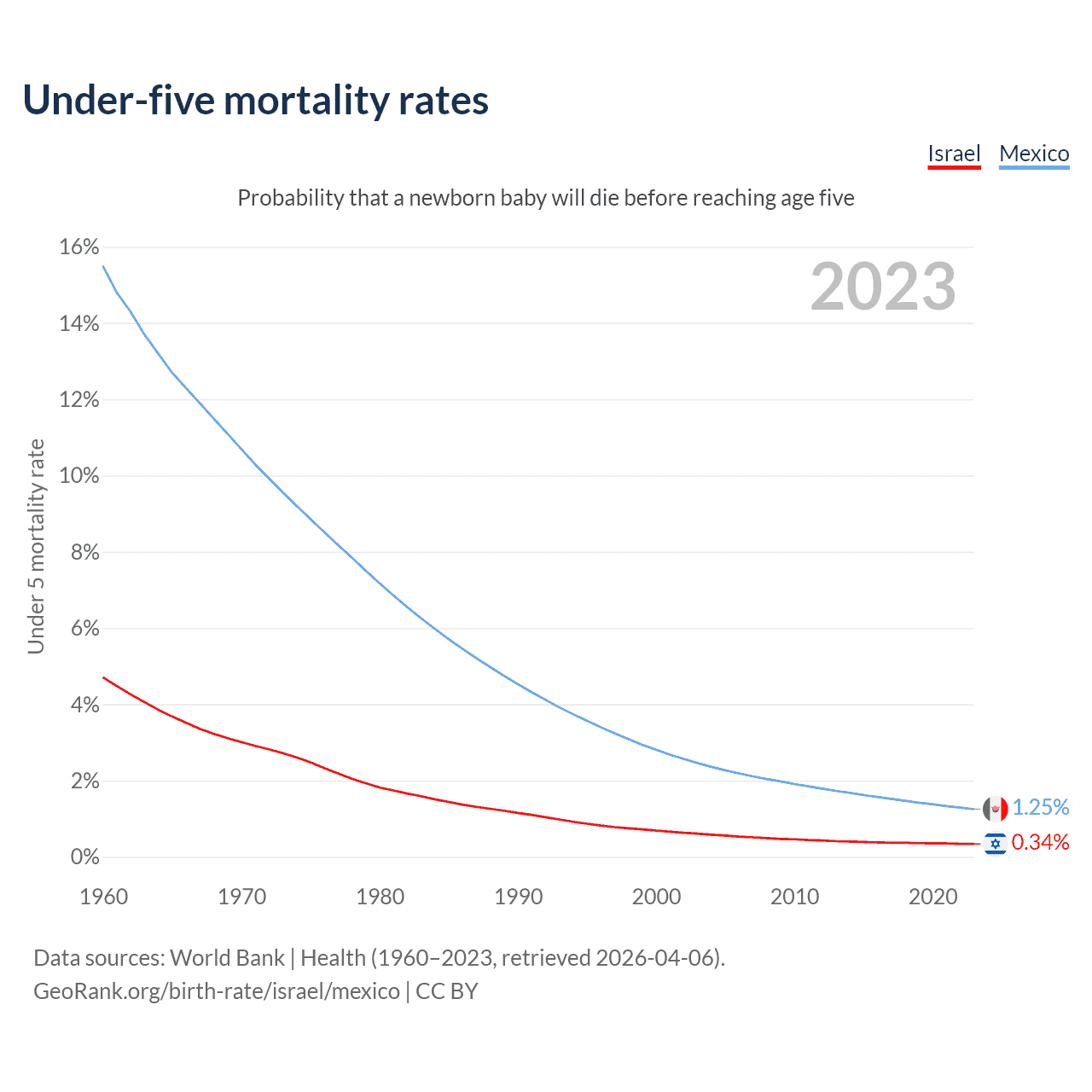 The chance that a newborn baby will die before reaching age five is 0.34% in Israel and 1.25% in Mexico. Above is a chart with historical data on under-five mortality rates.