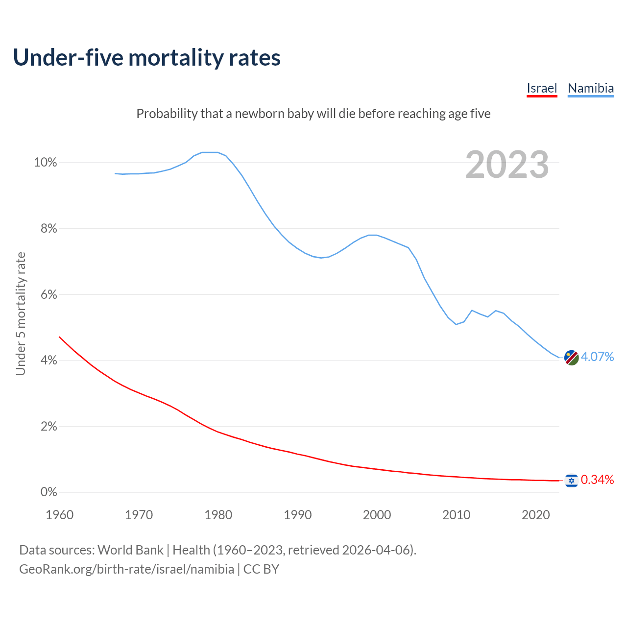 The chance that a newborn baby will die before reaching age five is 0.34% in Israel and 4.07% in Namibia. Above is a chart with historical data on under-five mortality rates.