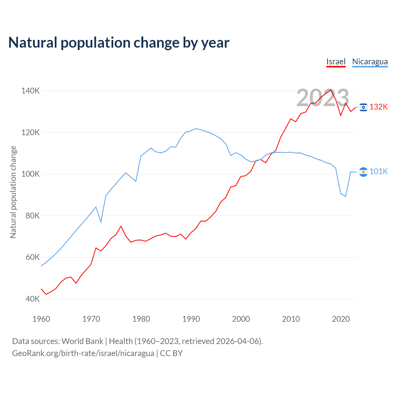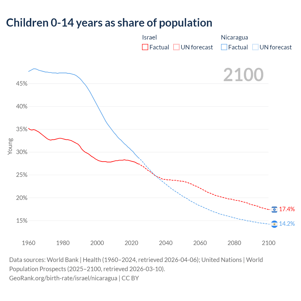 According to the latest available data on birth rates, the fertility rate in Israel was 2.85 children per woman in 2023, compared to 2.22 in Nicaragua in 2023. The replacement level is considered to be 2.1 children per woman.