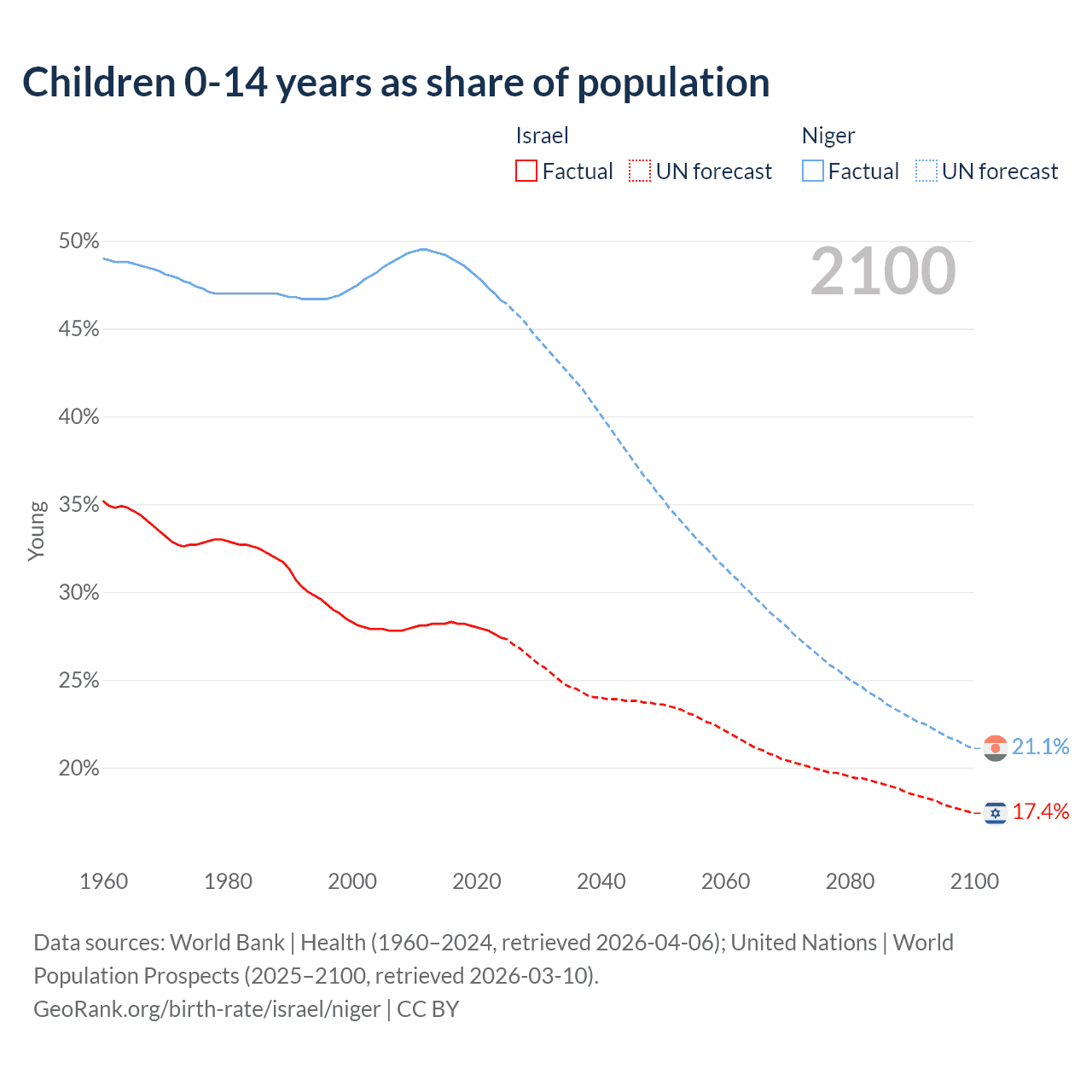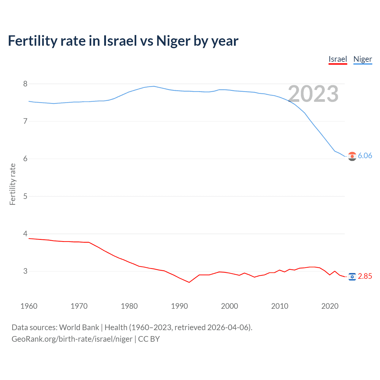 According to the latest available data on birth rates, the fertility rate in Israel was 2.85 children per woman in 2023, compared to 6.06 in Niger in 2023. The replacement level is considered to be 2.1 children per woman.