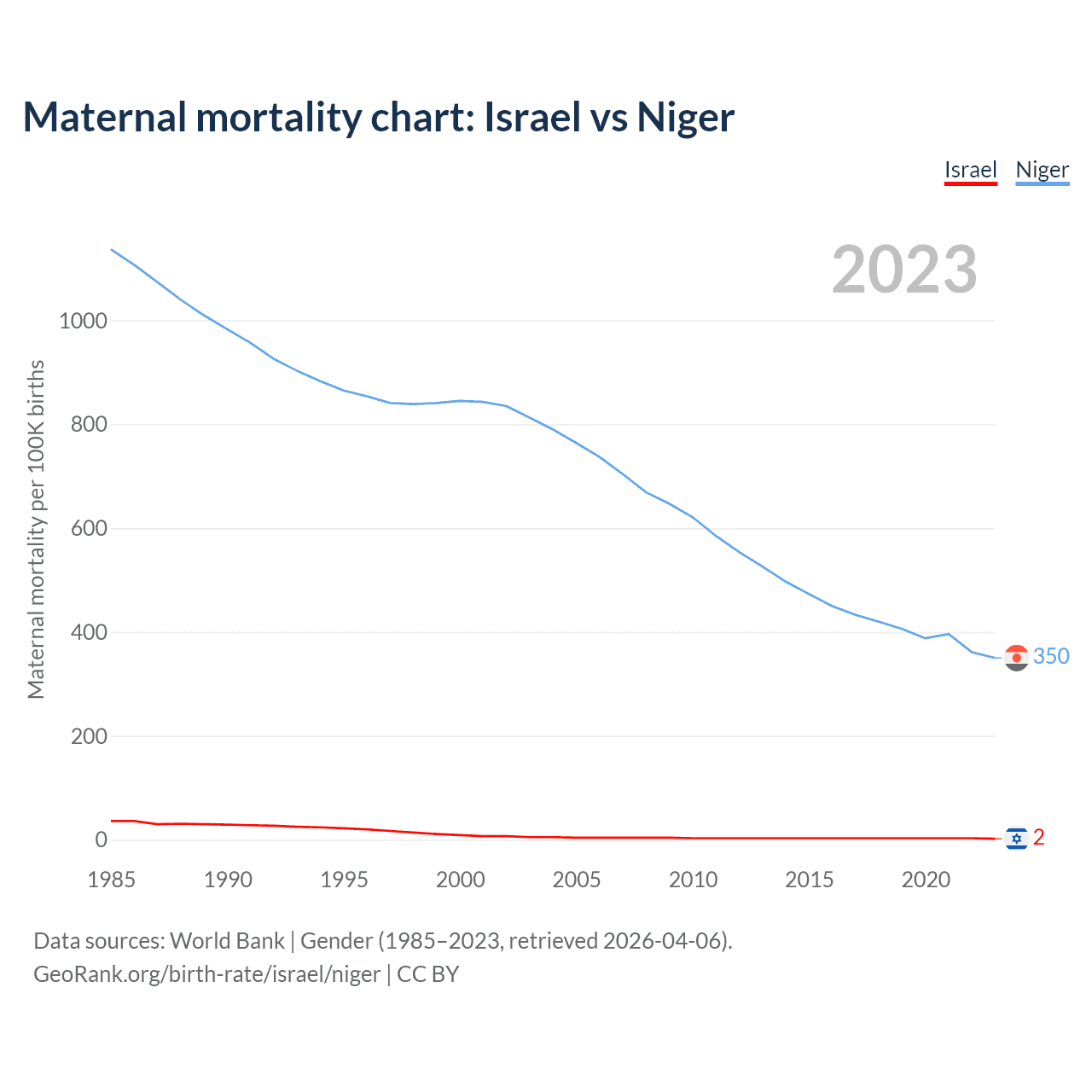 The maternal mortality rate, which is the probability of dying during childbirth or within 42 days of pregnancy termination, is 2 deaths per 100,000 live births in Israel, compared to 350 deaths in Niger.