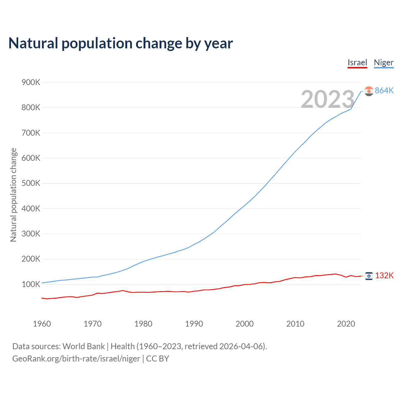 Israel has an annual birth rate of 18.6 births per 1,000 people, compared to 41.9 for Niger. The average number of children a woman is expected to have during her lifetime — the fertility rate, is 2.85 in Israel and 6.06 in Niger — 112.7% difference.