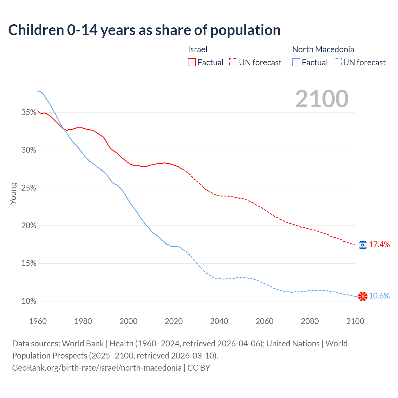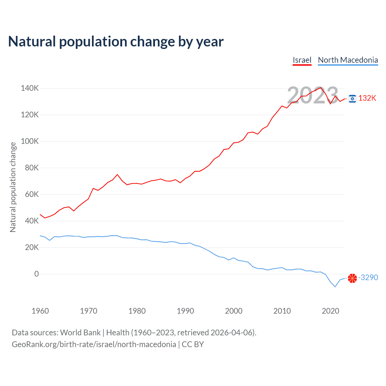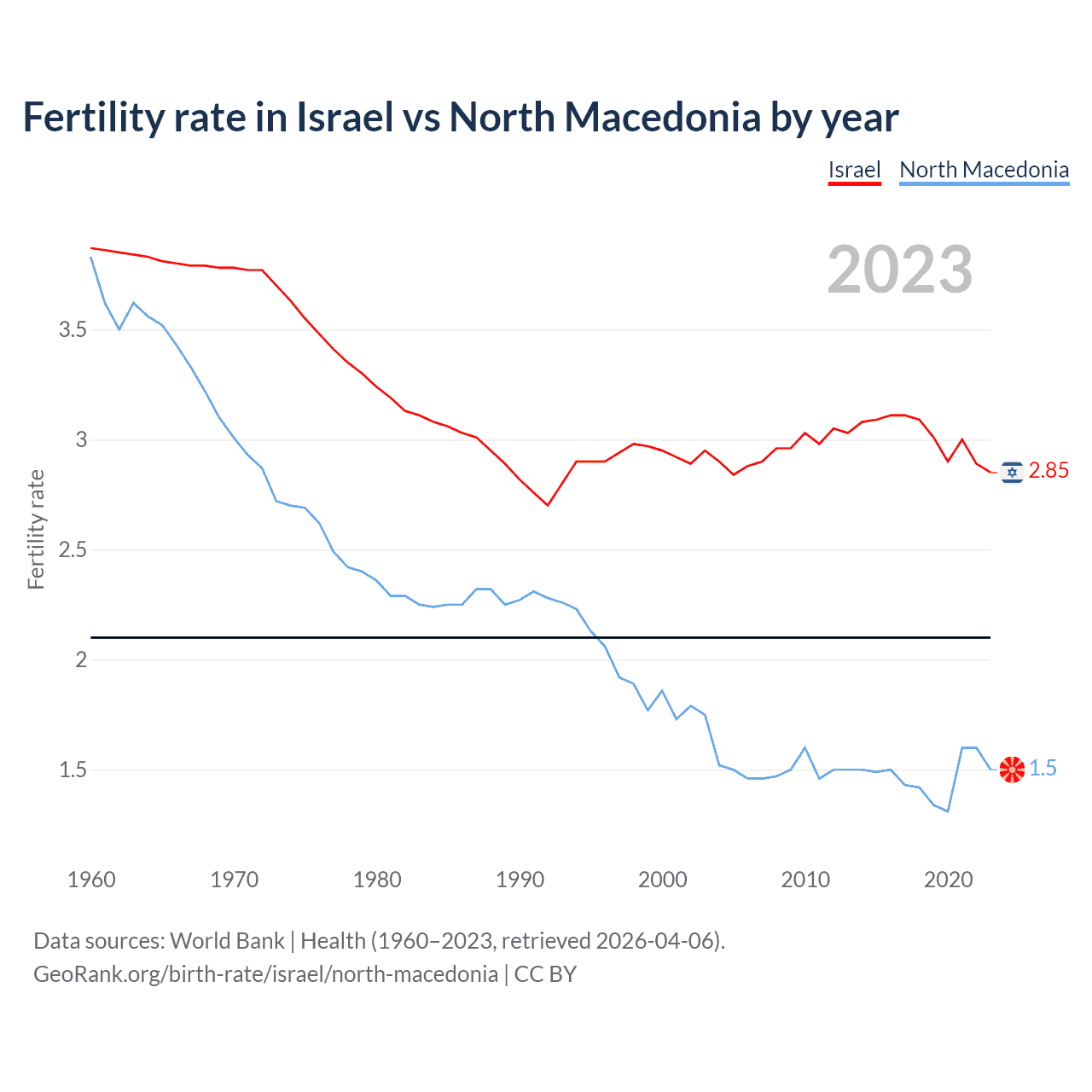 According to the latest available data on birth rates, the fertility rate in Israel was 2.85 children per woman in 2023, compared to 1.5 in North Macedonia in 2023. The replacement level is considered to be 2.1 children per woman.