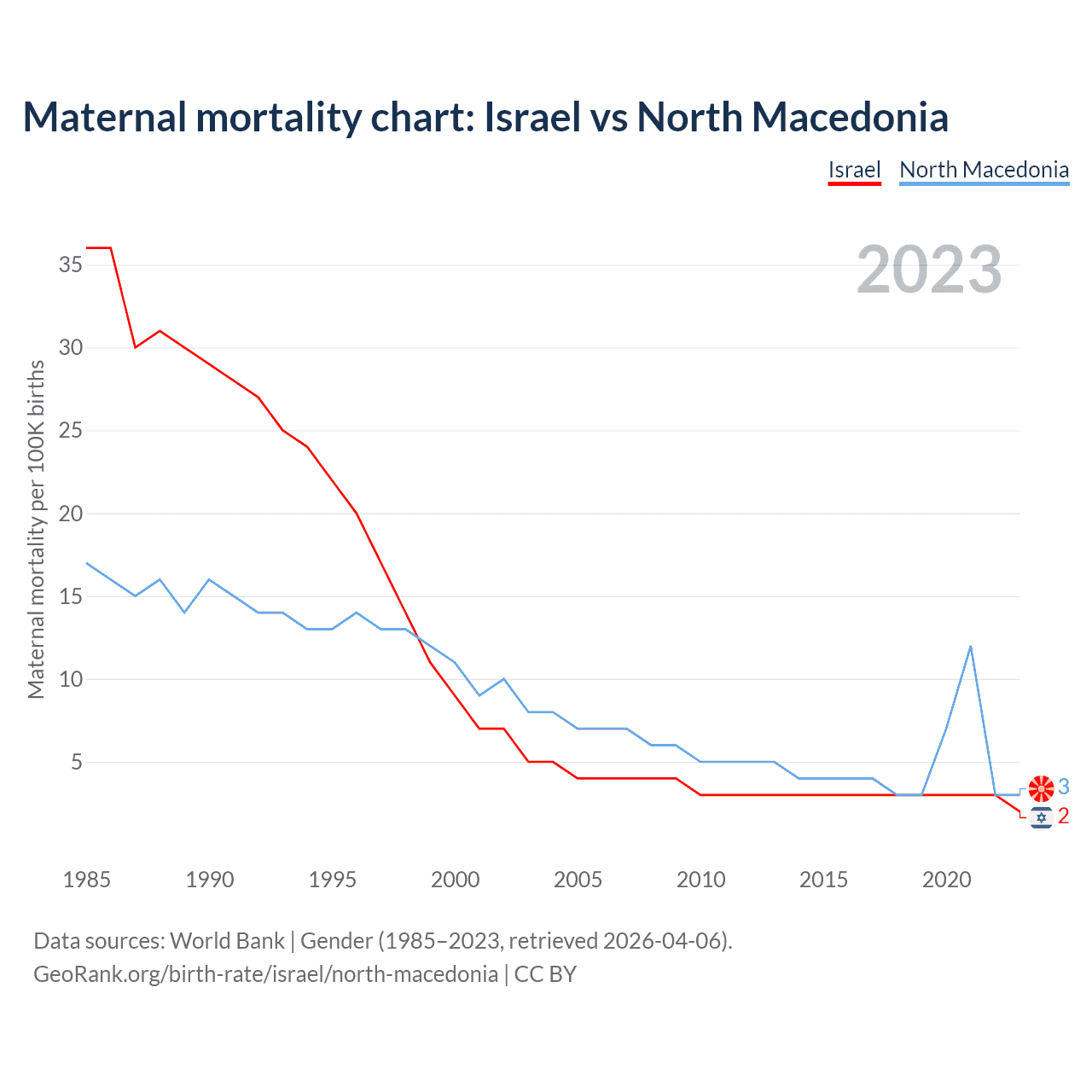 The maternal mortality rate, which is the probability of dying during childbirth or within 42 days of pregnancy termination, is 2 deaths per 100,000 live births in Israel, compared to 3 deaths in North Macedonia.