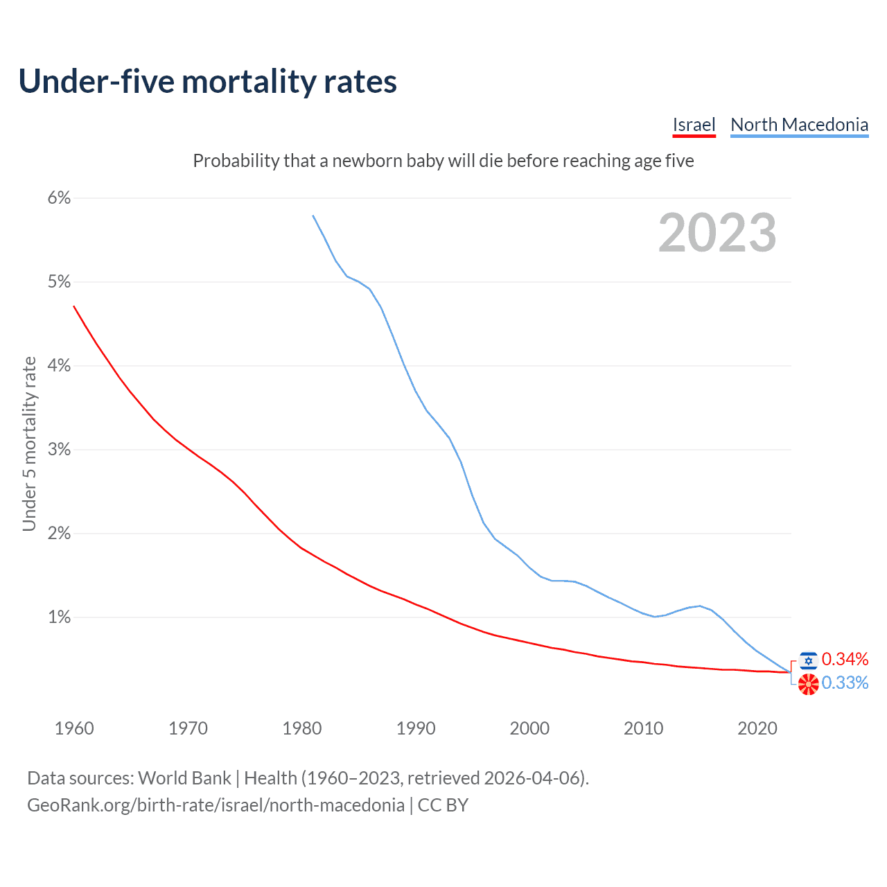 The chance that a newborn baby will die before reaching age five is 0.34% in Israel and 0.33% in North Macedonia. Above is a chart with historical data on under-five mortality rates.