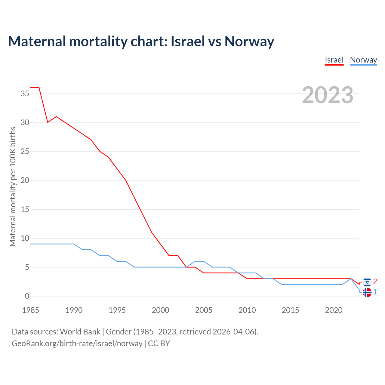 The maternal mortality rate, which is the probability of dying during childbirth or within 42 days of pregnancy termination, is 2 deaths per 100,000 live births in Israel, compared to 1 deaths in Norway.