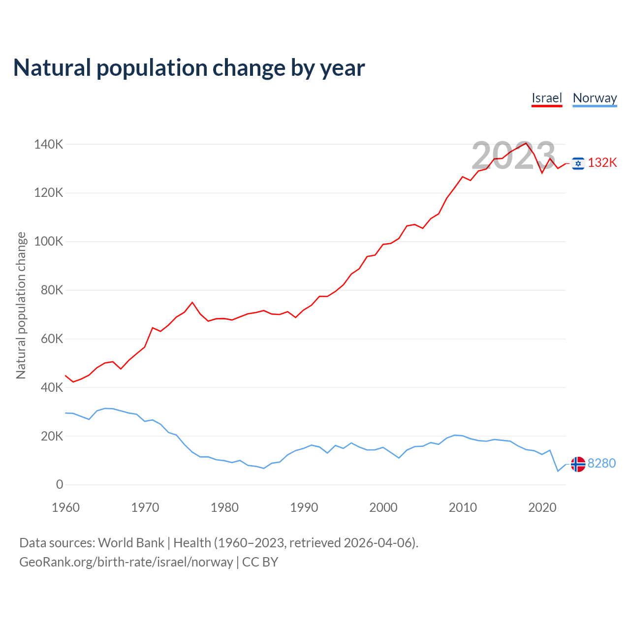 According to the latest available data on birth rates, the fertility rate in Israel was 2.85 children per woman in 2023, compared to 1.4 in Norway in 2023. The replacement level is considered to be 2.1 children per woman.
