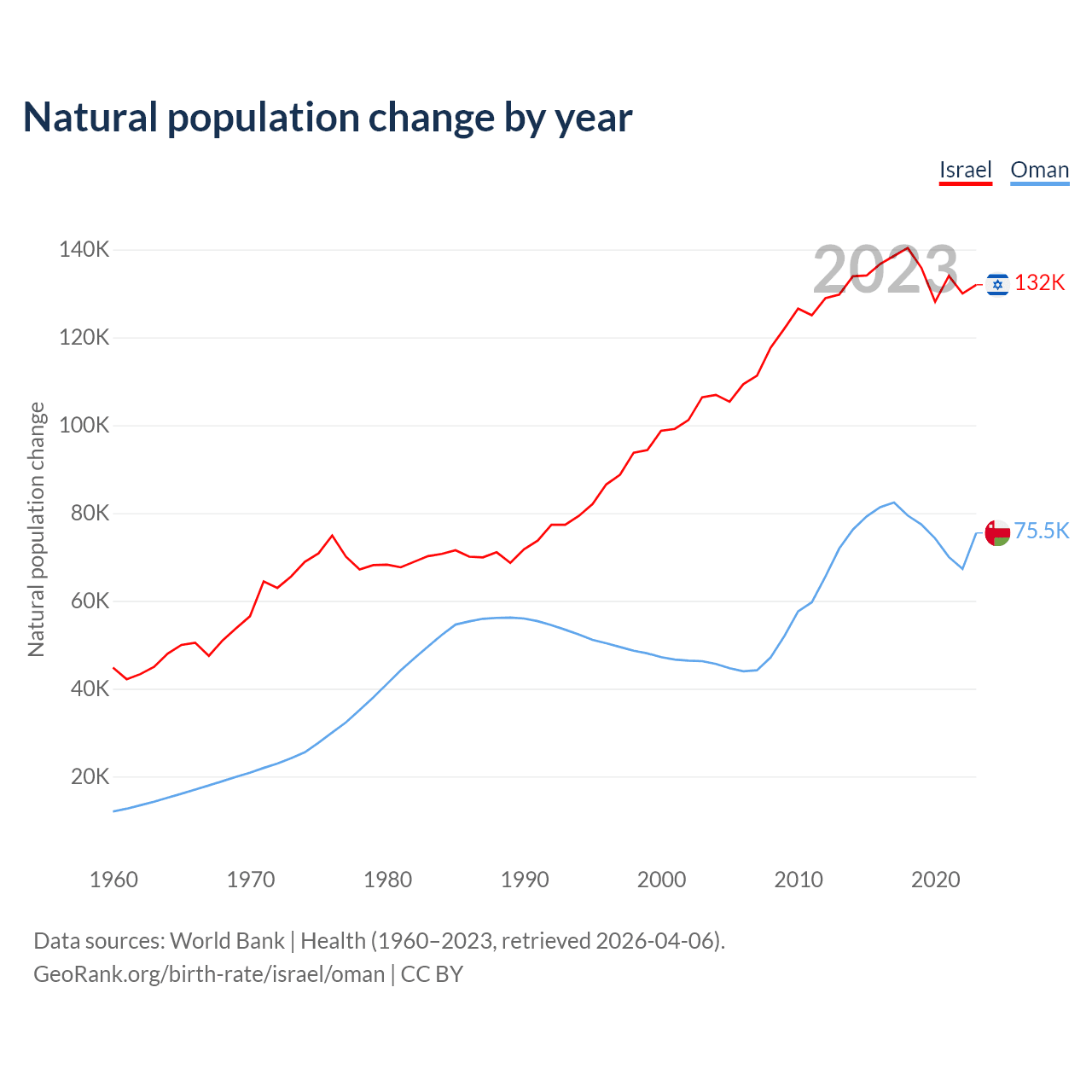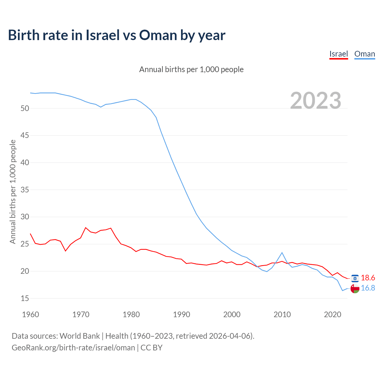 Israel has an annual birth rate of 18.6 births per 1,000 people, compared to 16.8 for Oman. The average number of children a woman is expected to have during her lifetime — the fertility rate, is 2.85 in Israel and 2.53 in Oman — 11.4% difference.
