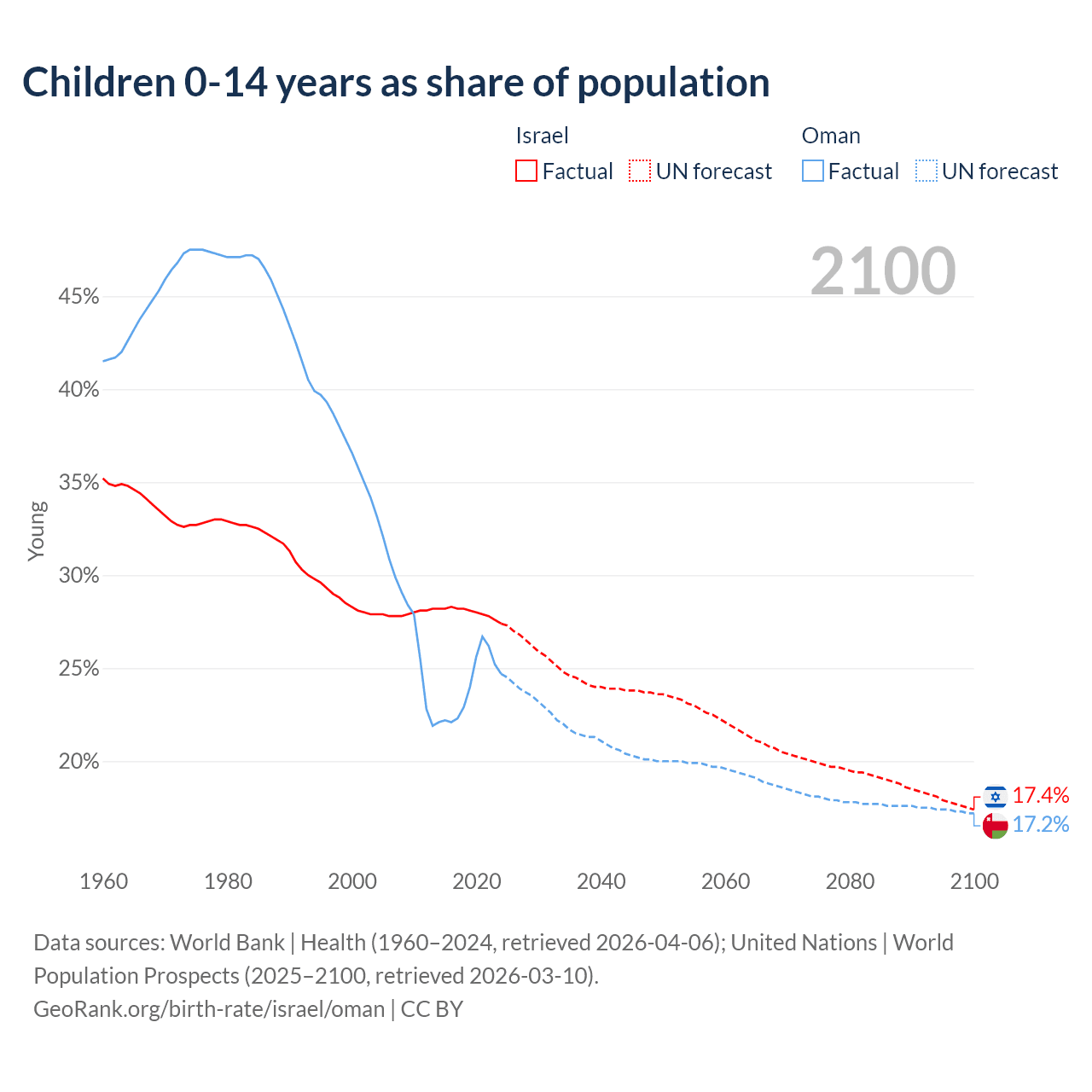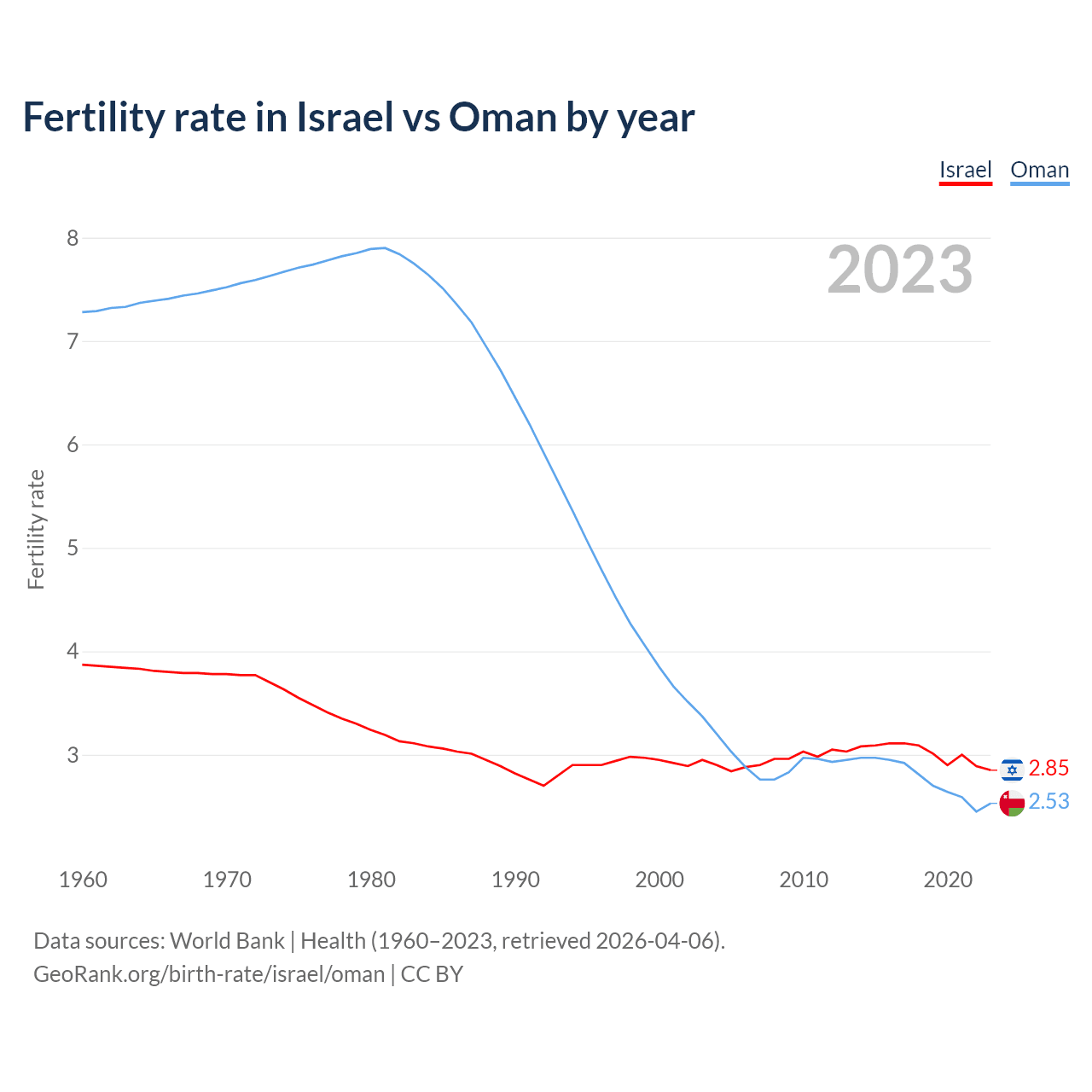 According to the latest available data on birth rates, the fertility rate in Israel was 2.85 children per woman in 2023, compared to 2.53 in Oman in 2023. The replacement level is considered to be 2.1 children per woman.