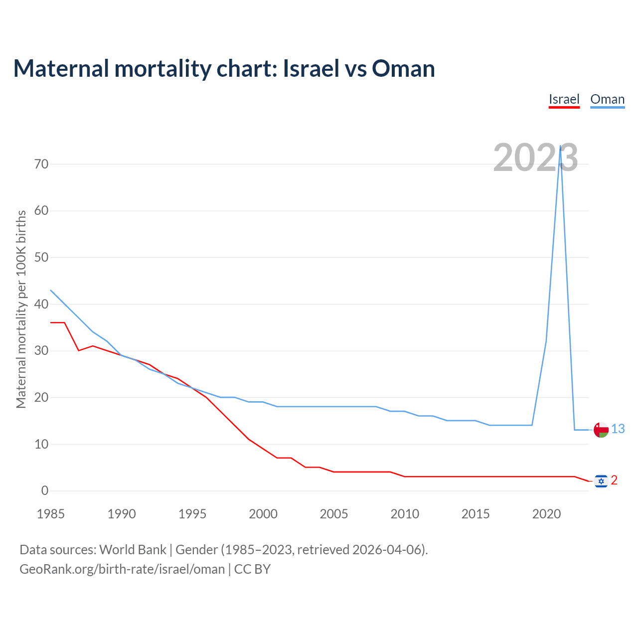 The maternal mortality rate, which is the probability of dying during childbirth or within 42 days of pregnancy termination, is 2 deaths per 100,000 live births in Israel, compared to 13 deaths in Oman.