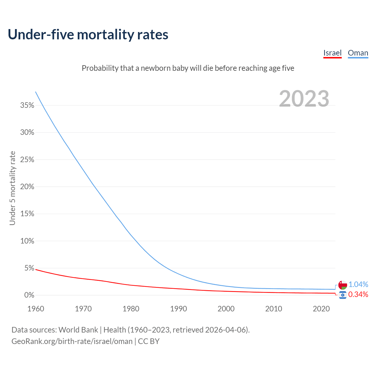 The chance that a newborn baby will die before reaching age five is 0.34% in Israel and 1.04% in Oman. Above is a chart with historical data on under-five mortality rates.