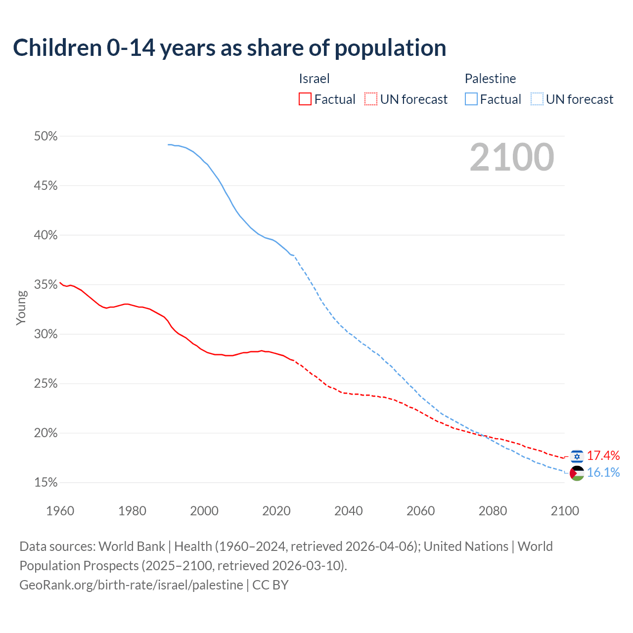 Israel has an annual birth rate of 18.6 births per 1,000 people, compared to 27.1 for Palestine. The average number of children a woman is expected to have during her lifetime — the fertility rate, is 2.85 in Israel and 3.31 in Palestine — 16.2% difference.