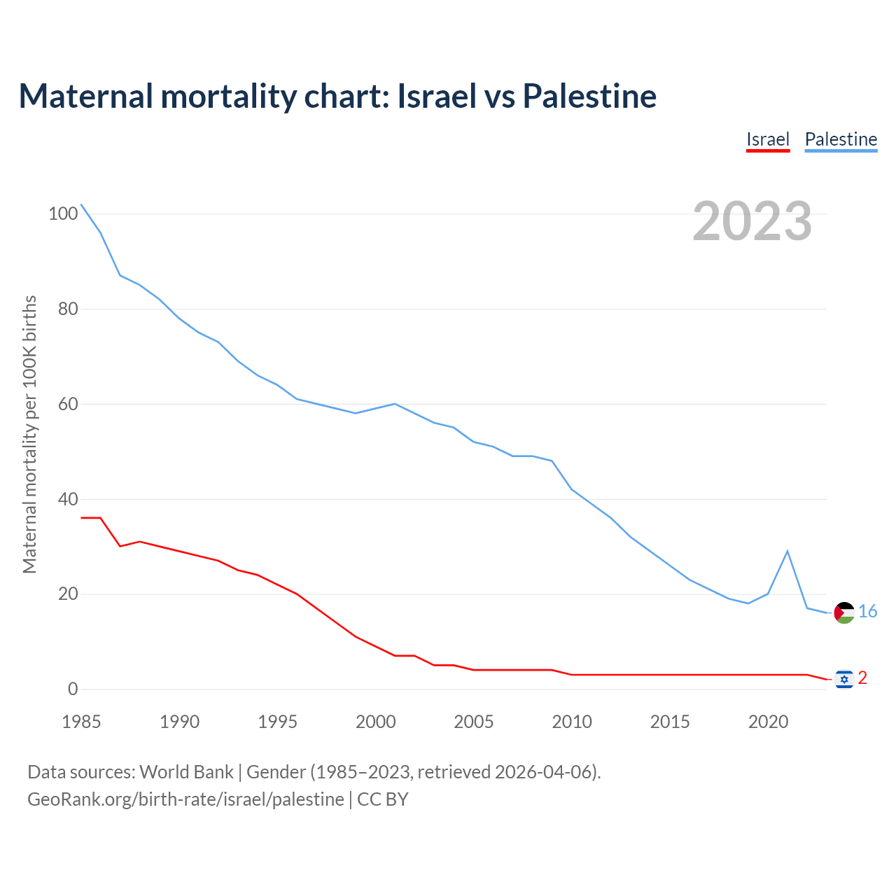 The maternal mortality rate, which is the probability of dying during childbirth or within 42 days of pregnancy termination, is 2 deaths per 100,000 live births in Israel, compared to 16 deaths in Palestine.