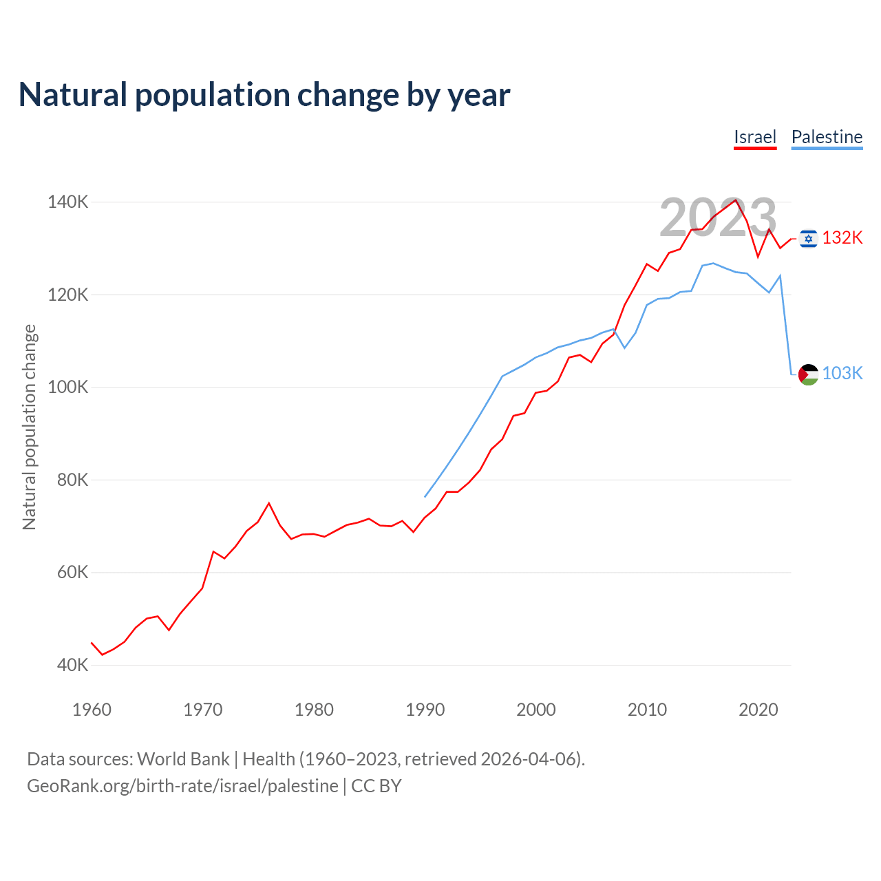 According to the latest available data on birth rates, the fertility rate in Israel was 2.85 children per woman in 2023, compared to 3.31 in Palestine in 2023. The replacement level is considered to be 2.1 children per woman.