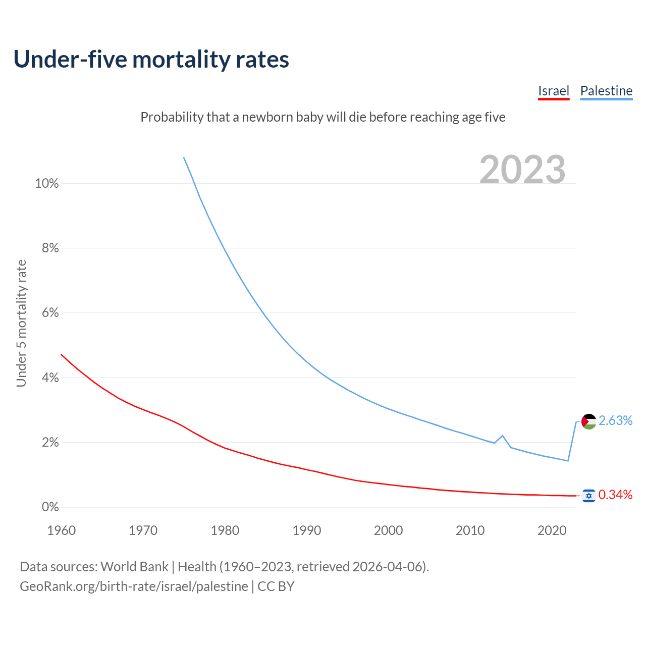 The chance that a newborn baby will die before reaching age five is 0.34% in Israel and 2.63% in Palestine. Above is a chart with historical data on under-five mortality rates.