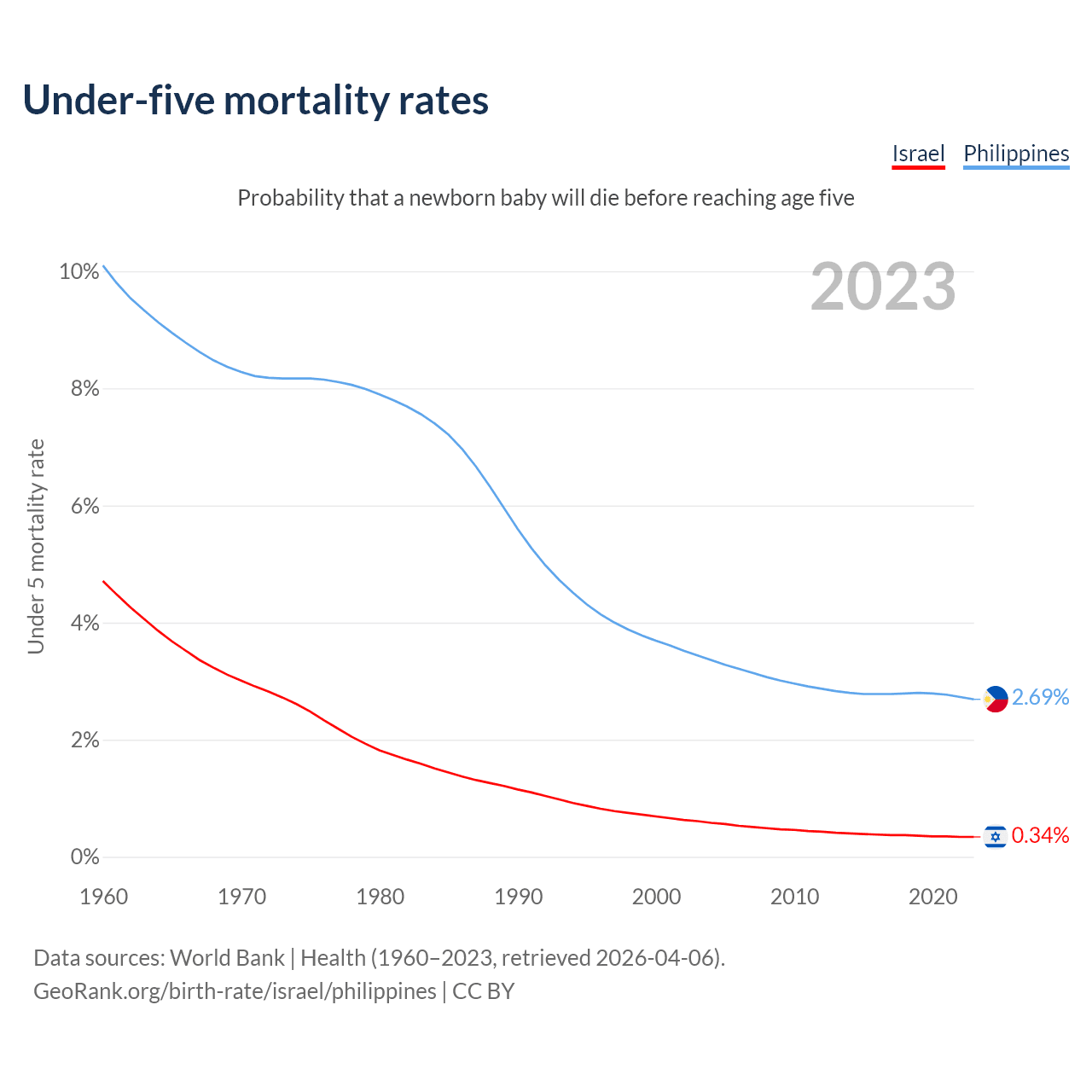 The chance that a newborn baby will die before reaching age five is 0.34% in Israel and 2.69% in the Philippines. Above is a chart with historical data on under-five mortality rates.
