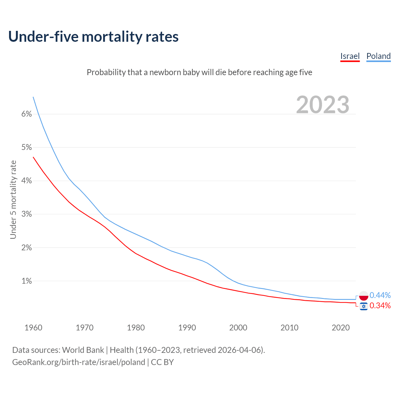 The chance that a newborn baby will die before reaching age five is 0.34% in Israel and 0.44% in Poland. Above is a chart with historical data on under-five mortality rates.