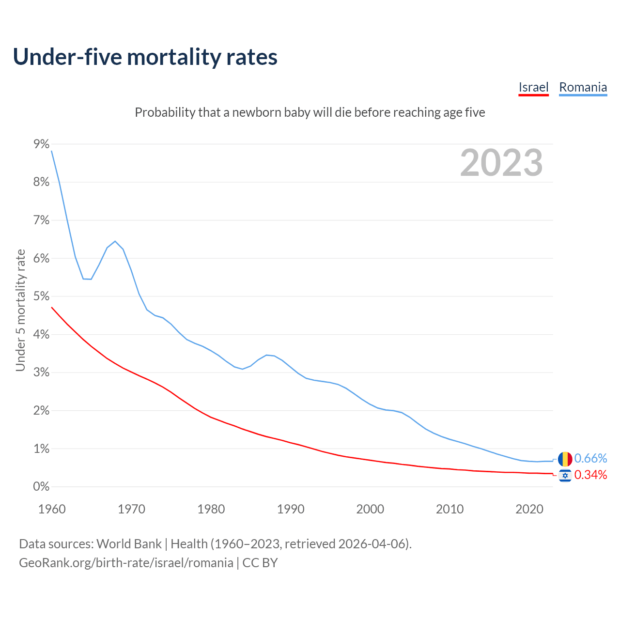 The chance that a newborn baby will die before reaching age five is 0.34% in Israel and 0.66% in Romania. Above is a chart with historical data on under-five mortality rates.