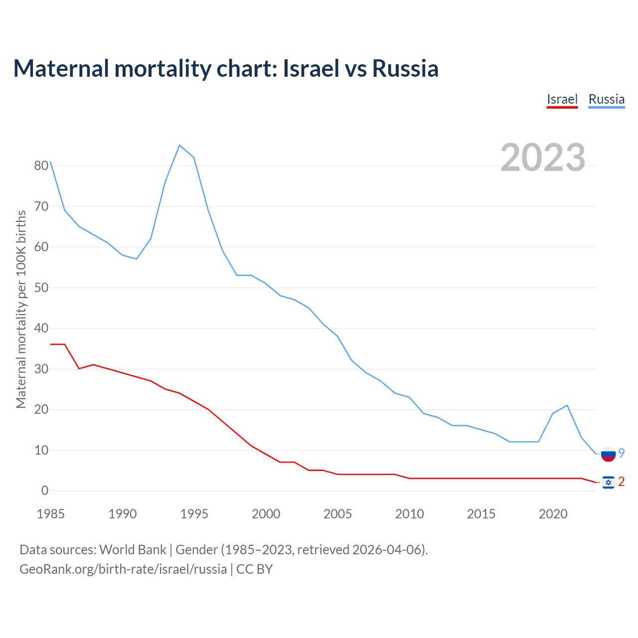 The maternal mortality rate, which is the probability of dying during childbirth or within 42 days of pregnancy termination, is 2 deaths per 100,000 live births in Israel, compared to 9 deaths in Russia.
