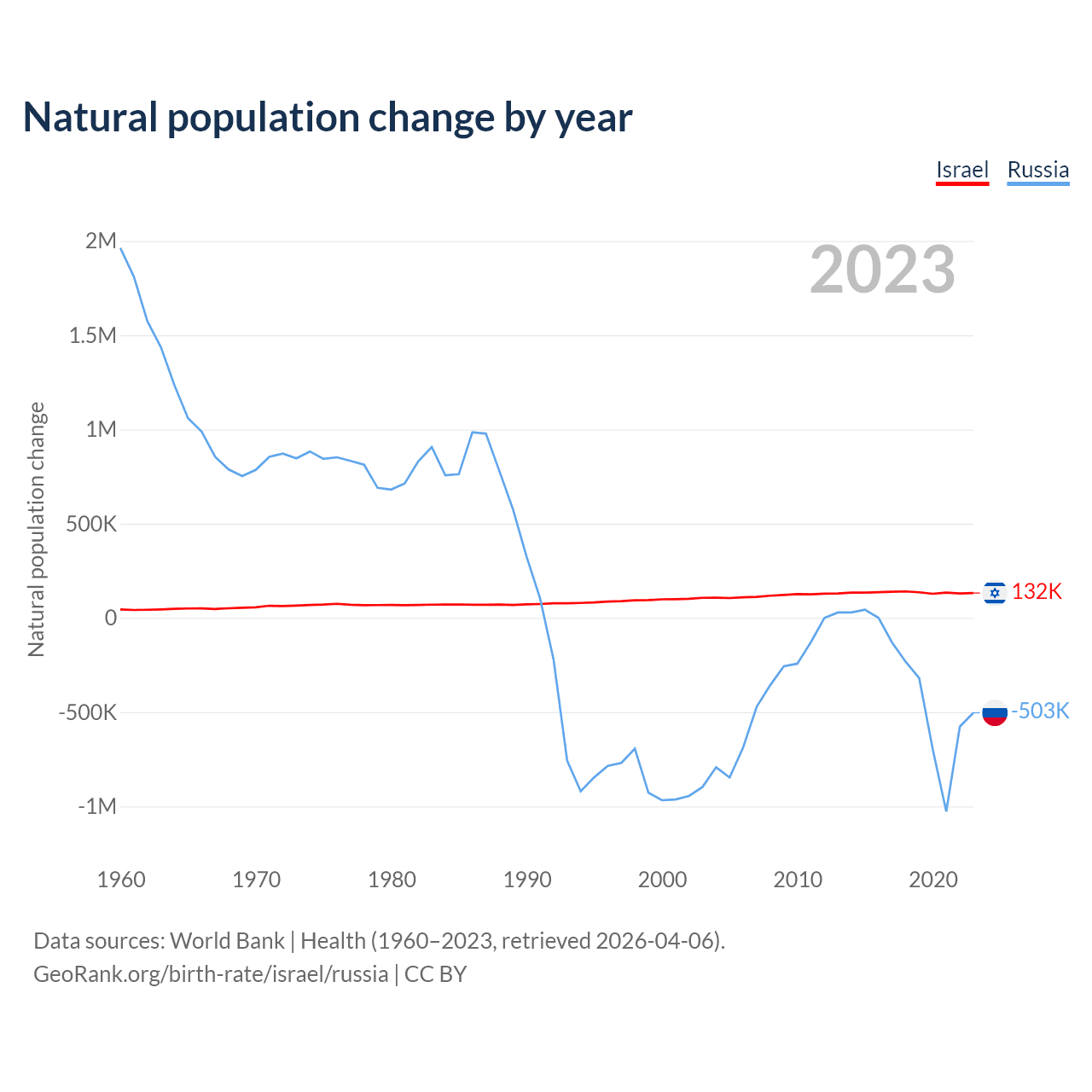 According to the latest available data on birth rates, the fertility rate in Israel was 2.85 children per woman in 2023, compared to 1.41 in Russia in 2023. The replacement level is considered to be 2.1 children per woman.
