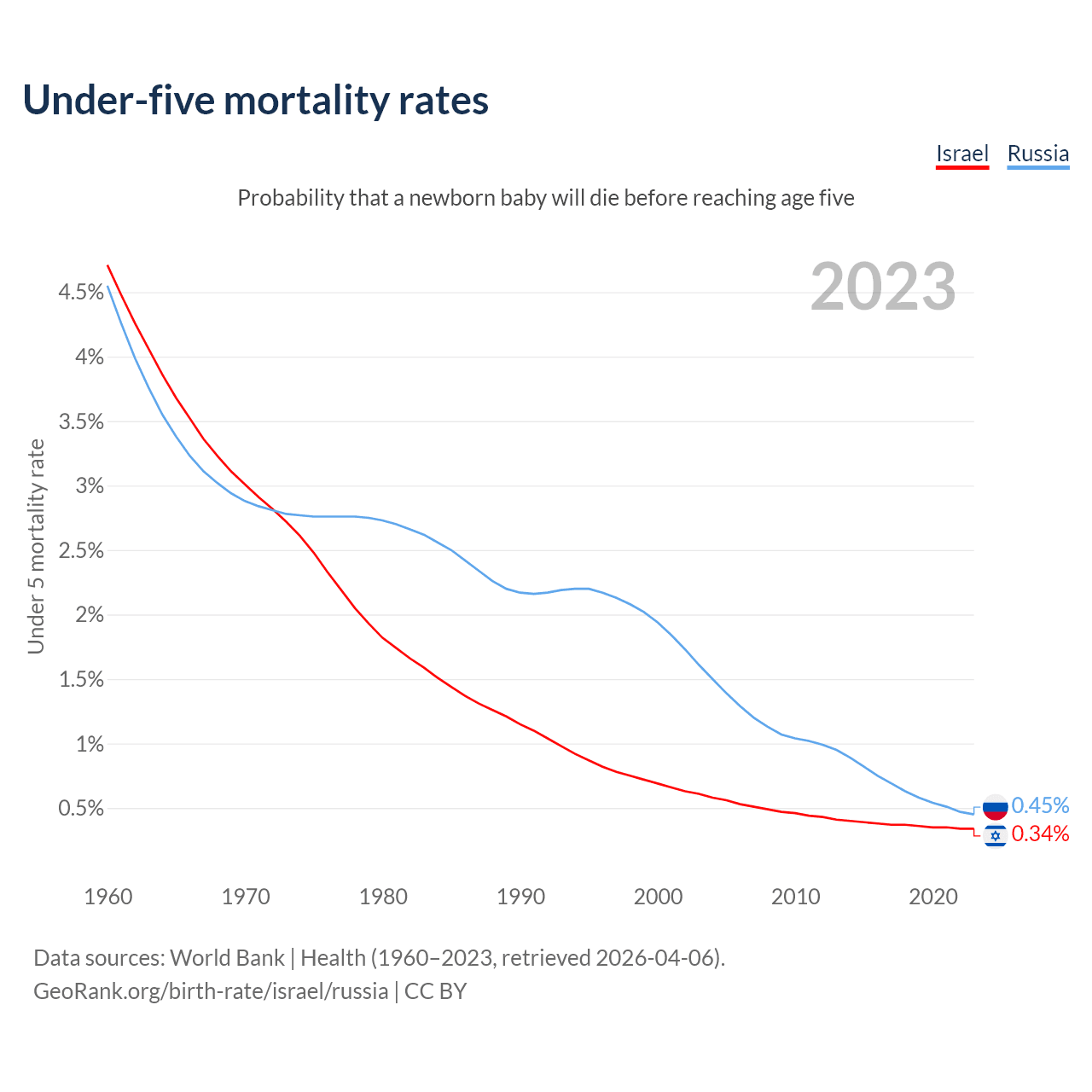The chance that a newborn baby will die before reaching age five is 0.34% in Israel and 0.45% in Russia. Above is a chart with historical data on under-five mortality rates.