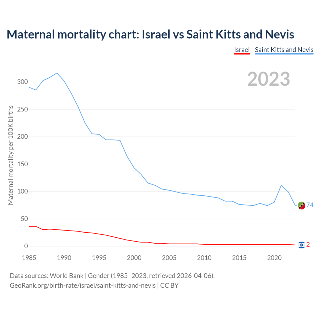 The maternal mortality rate, which is the probability of dying during childbirth or within 42 days of pregnancy termination, is 2 deaths per 100,000 live births in Israel, compared to 74 deaths in Saint Kitts and Nevis.